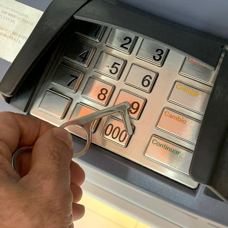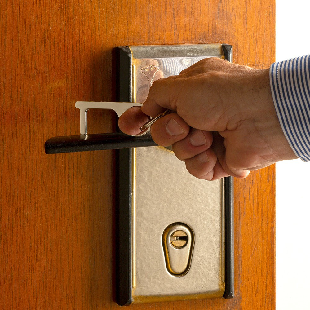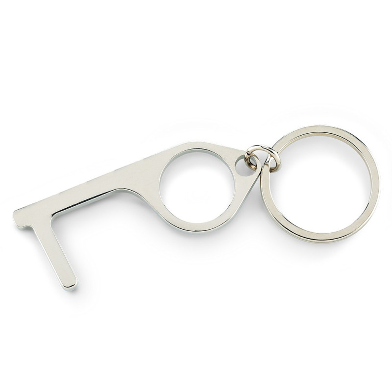 Llavero en Aleación de Zinc con recubrimiento plateado. Diseño ergonómico que permite fácilmente abrir puertas, presionar botones, halar palancas. Reduce la contaminación y la exposición de los dedos a superficies y reduce el área de contacto hasta en 99%. Puede usarlo en pantallas, puertas y botones públicos. Fácil de cargar. Apto como stylus en smartphones que no tengan película protectora. Empaque caja individual.