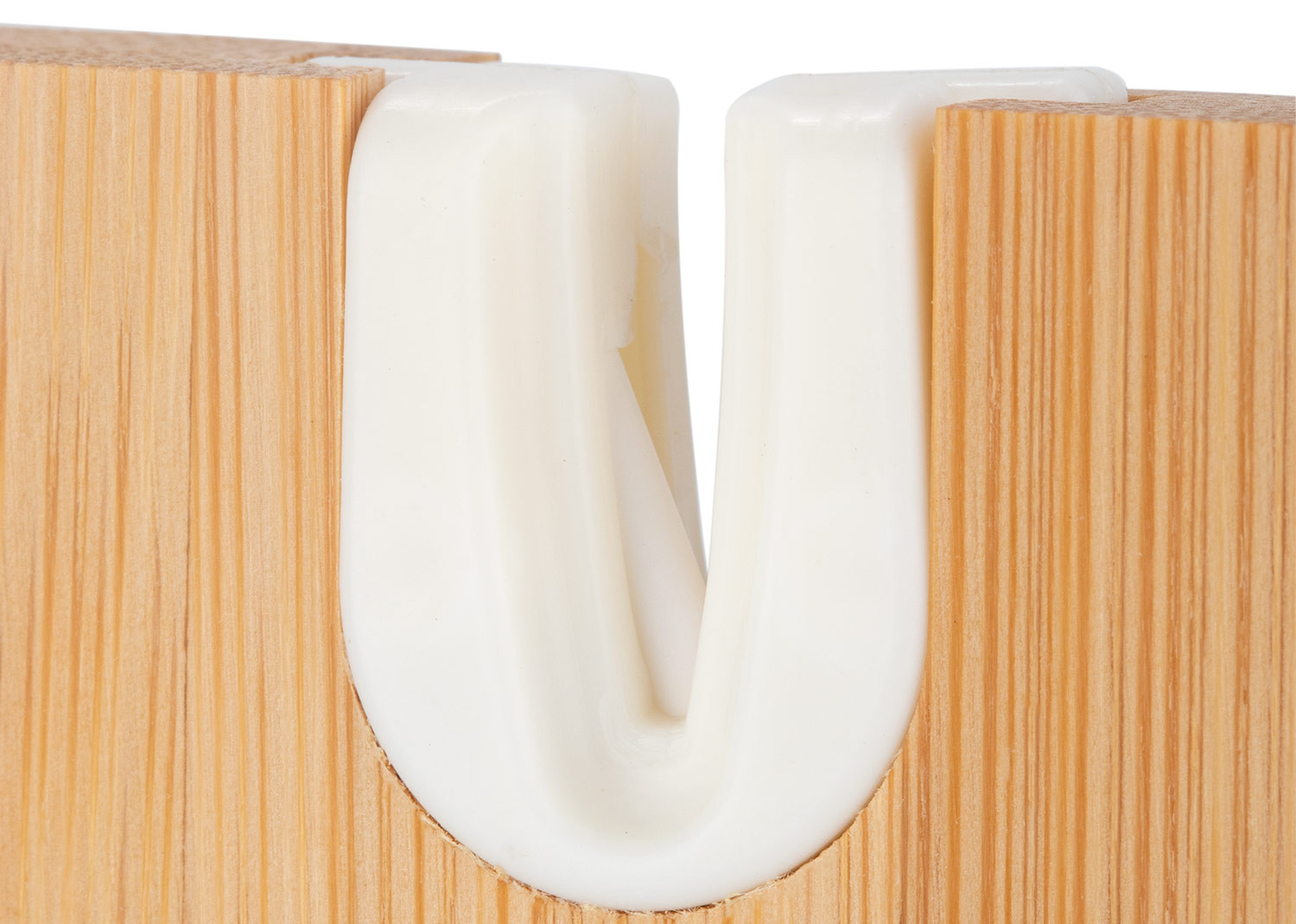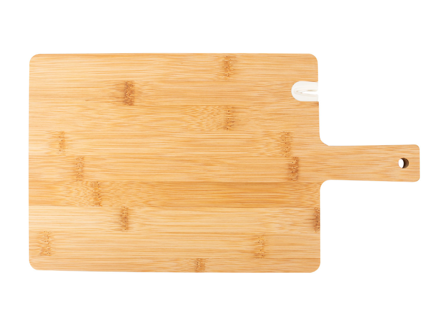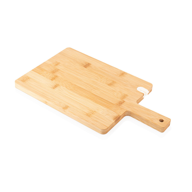 Tabla de cortar fabricada en bambú, resistente y duradera, con afilador de cuchillos integrado en una de las esquinas para mayor practicidad en la cocina. Su diseño incluye asa para facilitar el manejo y almacenamiento. Ideal para preparar alimentos manteniendo tus cuchillos siempre listos para usar.