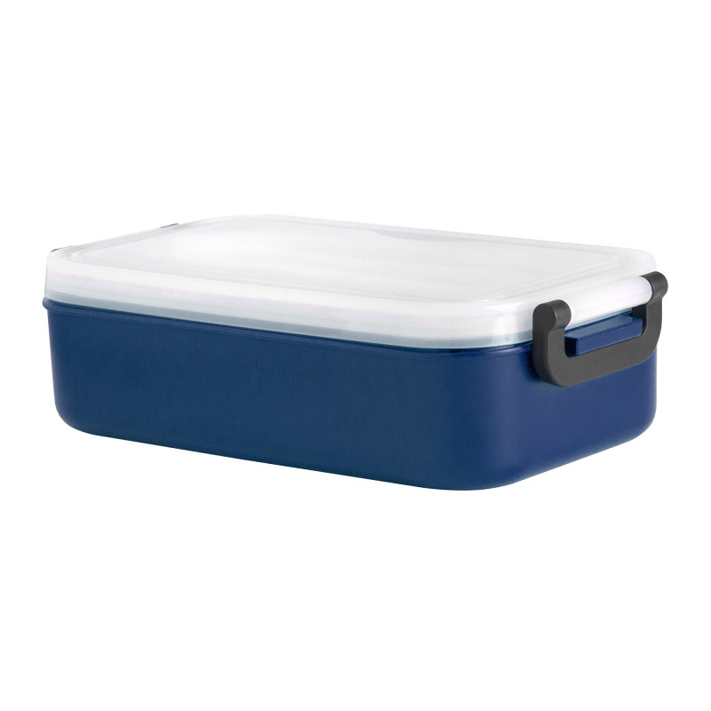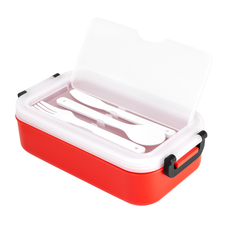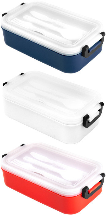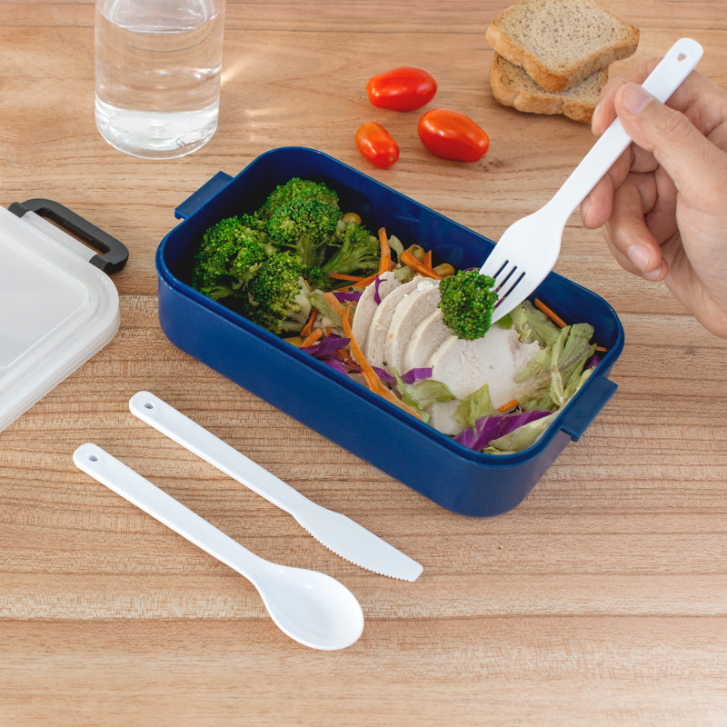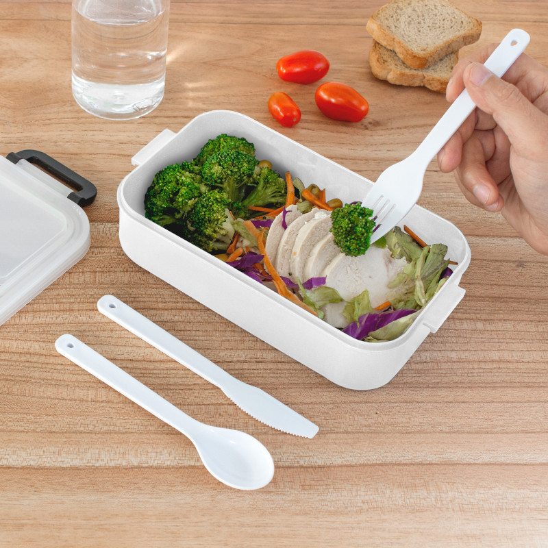 11,5 x 5,8 x 21,5 cm. Plástico PP. Contenedor de alimentos. Tapa translúcida con bandeja porta cubiertos, anillo de silicona antiderrame y ajustes de seguridad en sus laterales. Set de 3 cubiertos plásticos de color blanco (tenedor, cuchillo, cuchara) de 15 cm de largo.