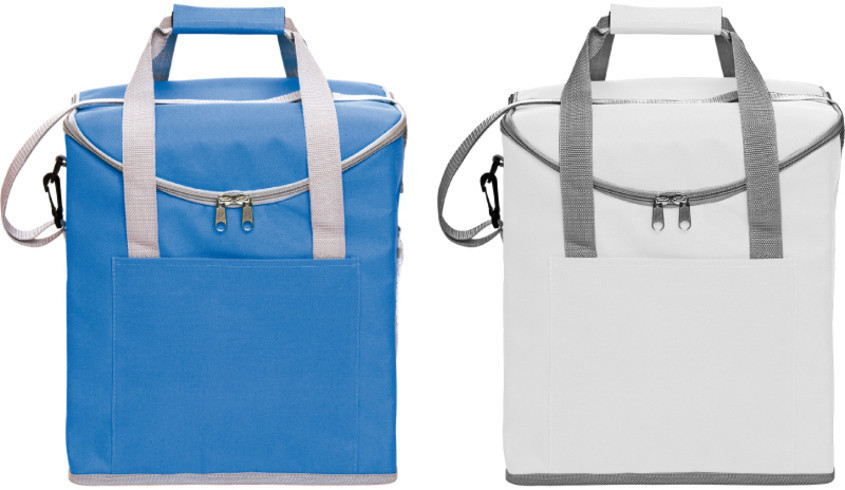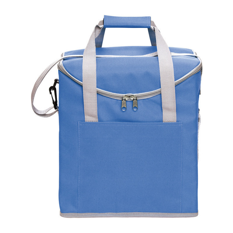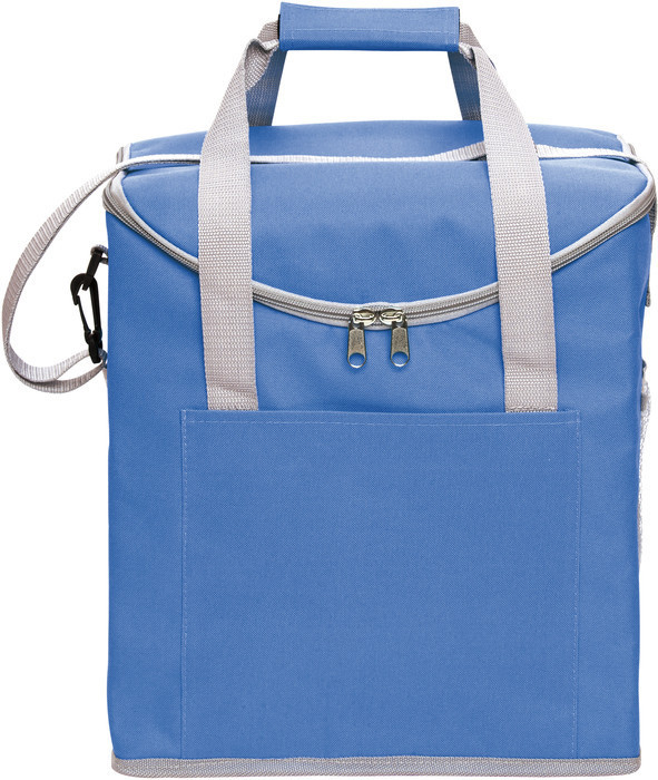 Capacidad 37 litros. Poliéster. 600D Lonchera térmica con recubrimiento interior metalizado. Un bolsillo frontal y dos bolsillos laterales de red. Correa tipo bandolera y dos manijas reforzadas con cierre de velcro. Capacidad hasta 6 botellas de 2,5 lt