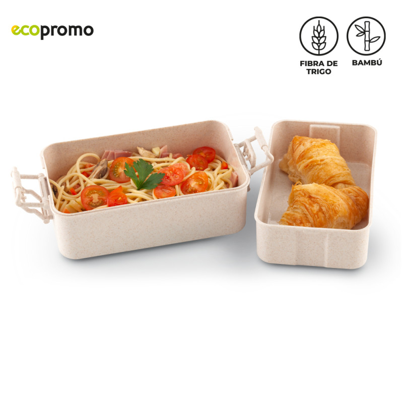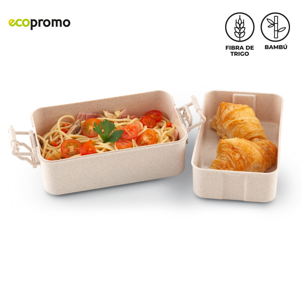 Portacomidas en trigo con tapa en bambú. Mezcla con material ecológico en fibra de trigo (50%-60% aprox). El porcentaje de material ecológico tiene un promedio de biodegradabilidad de 2-3 años después del fin de su vida útil. Incluye 2 recipientes, 1 tenedor, 1 cuchillo y 1 cuchara.