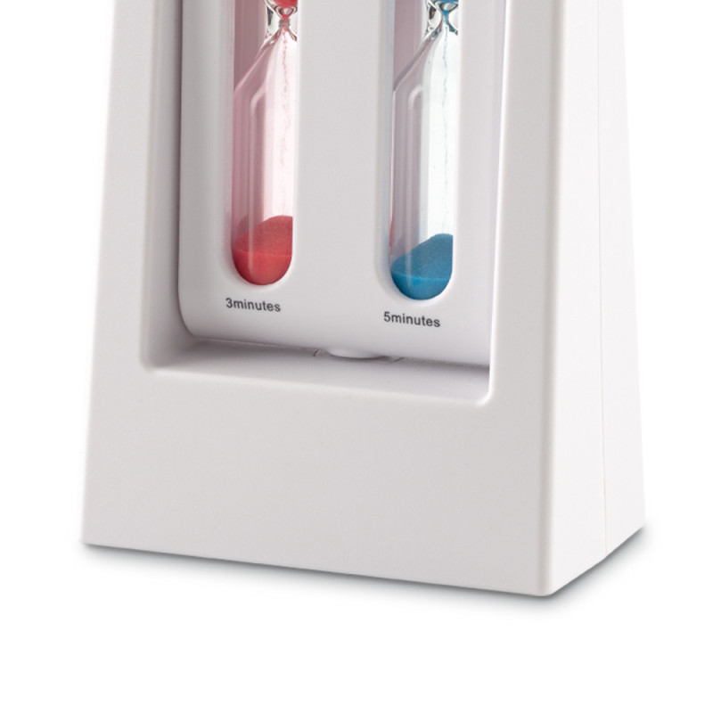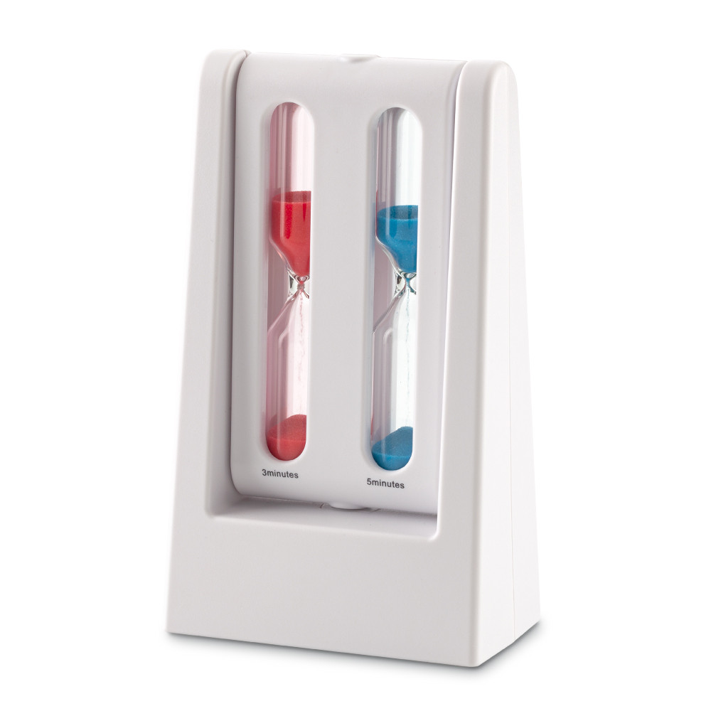 Reloj de arena plástico. Tiene dos timers: uno de 3 min y otro de 5 min (Diferencia +/- de 10seg). Empaque caja individual.