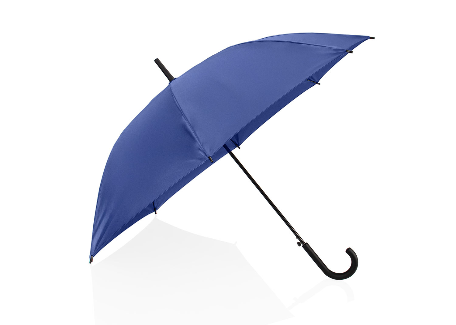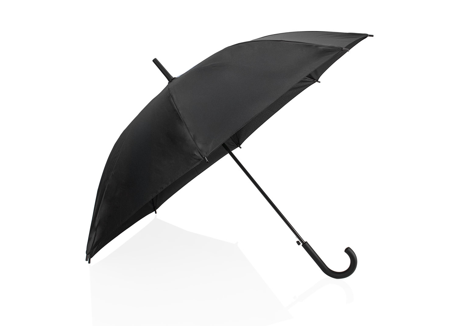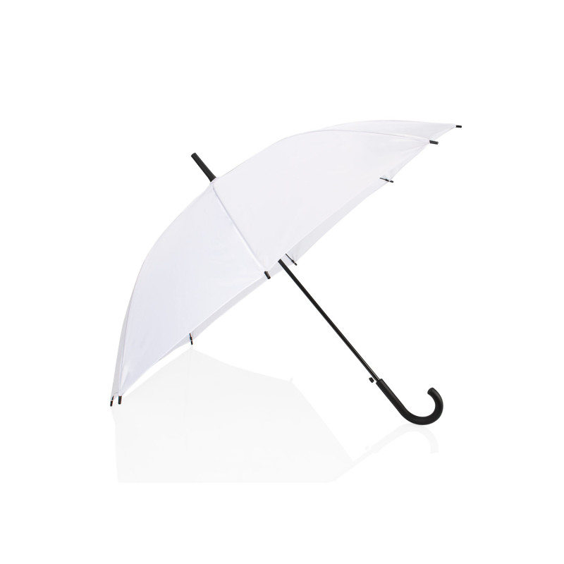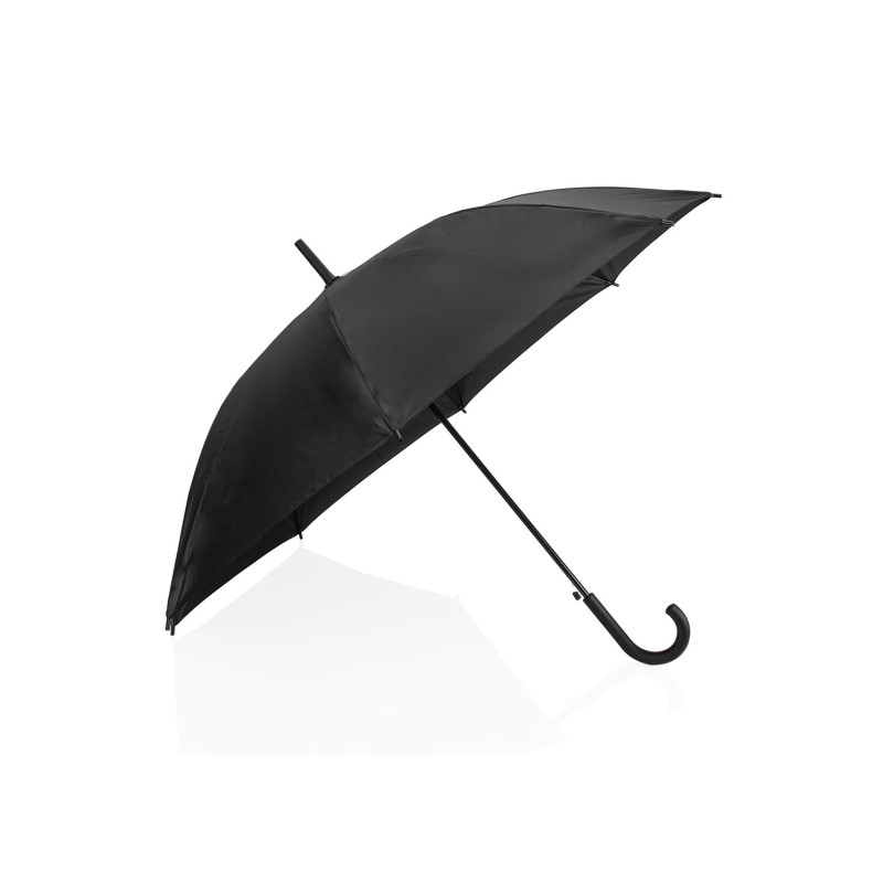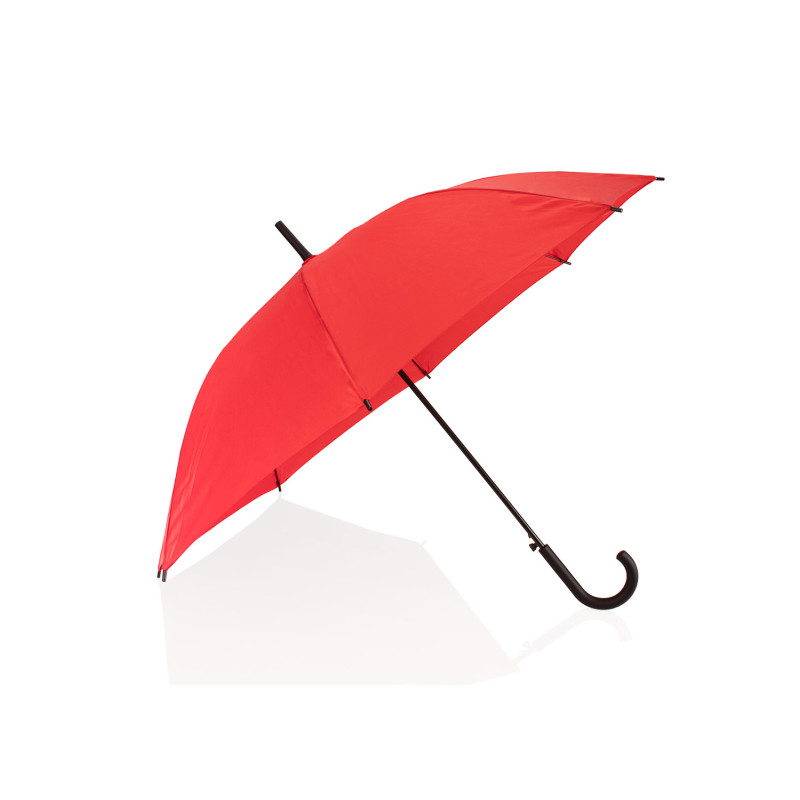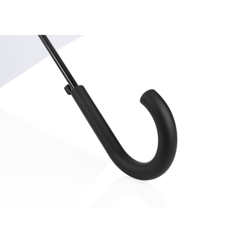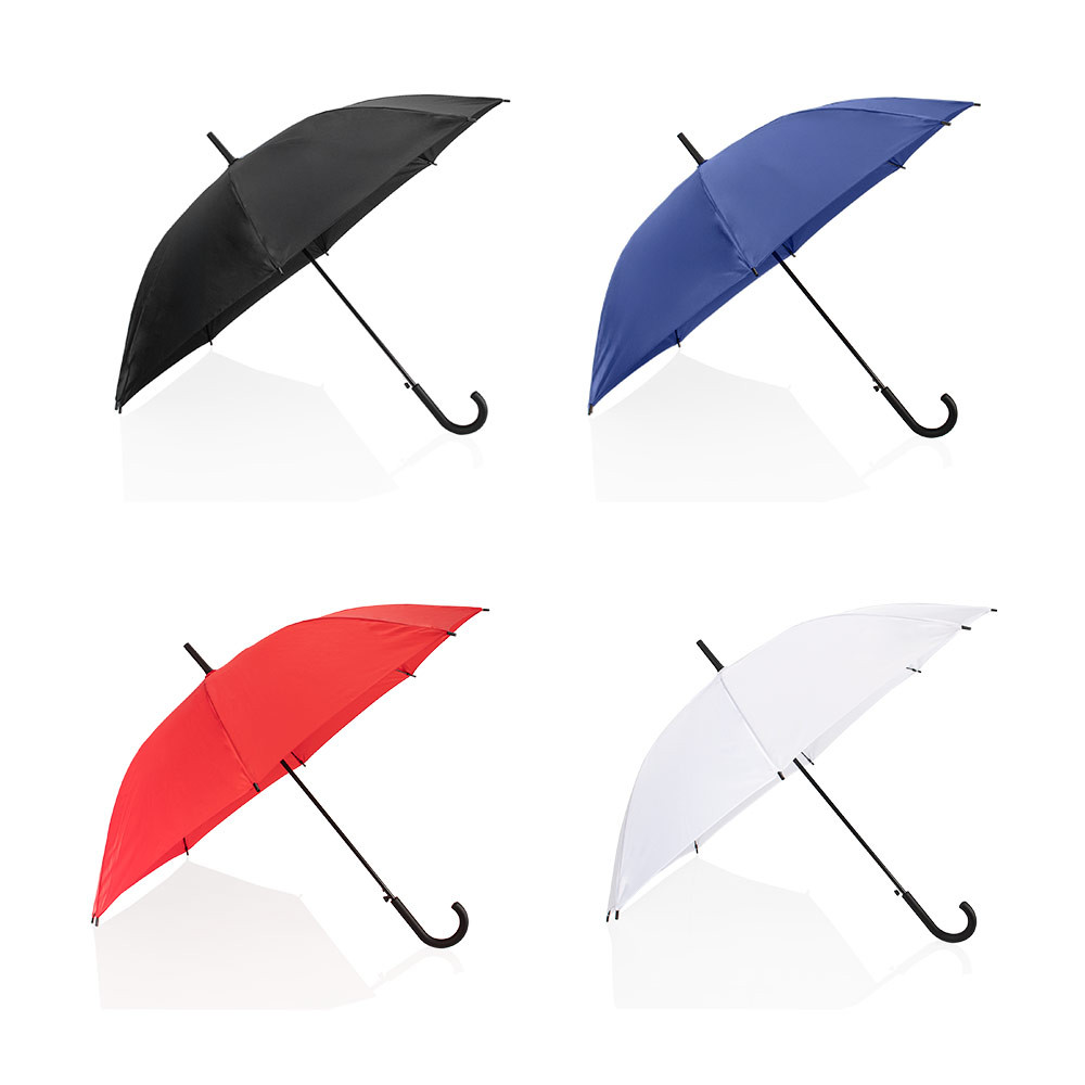 Paraguas tipo recto de 23" con apertura automática. Cuenta con estructura metálica con recubrimiento negro, eje central metálico y varillas largas de fibra de vidrio. Mango curvo en plástico PP con acabado tipo goma (soft touch), en el mismo color de la tela. Incluye puntas y remate superior plásticos.