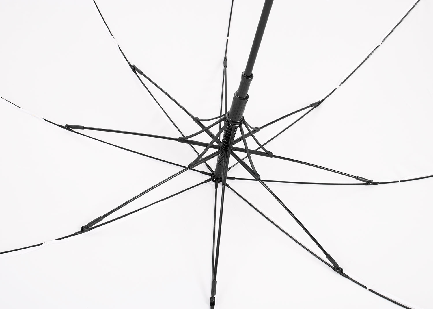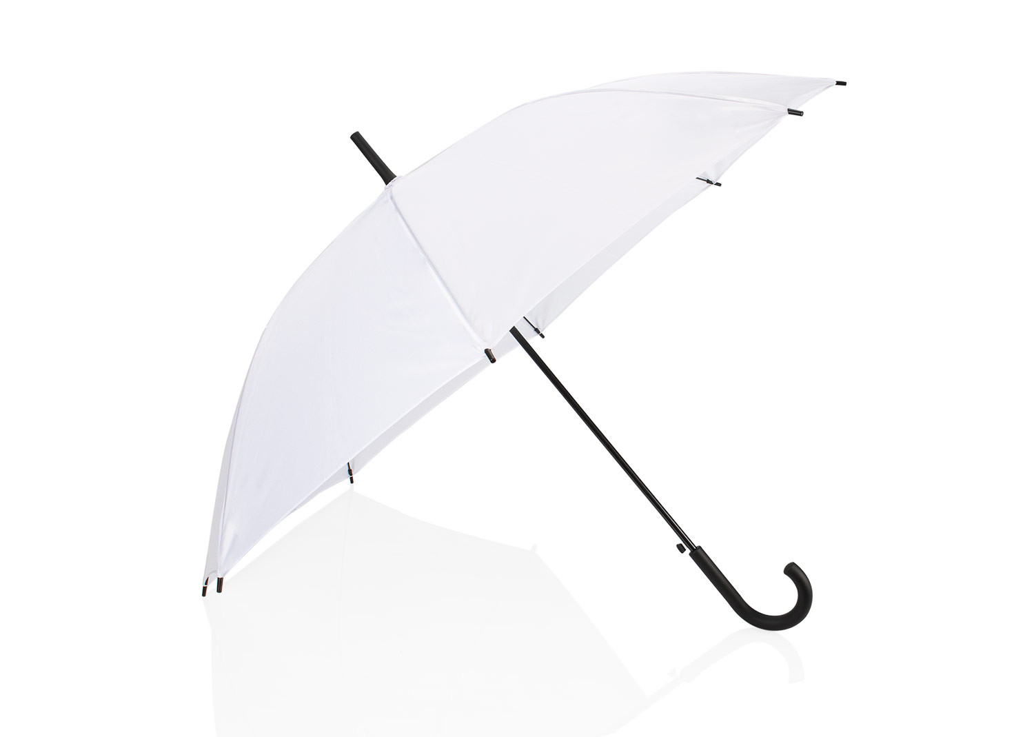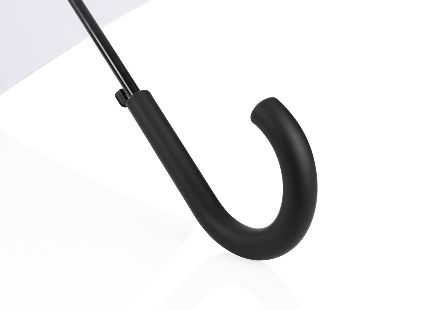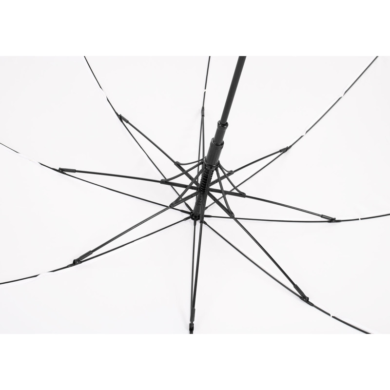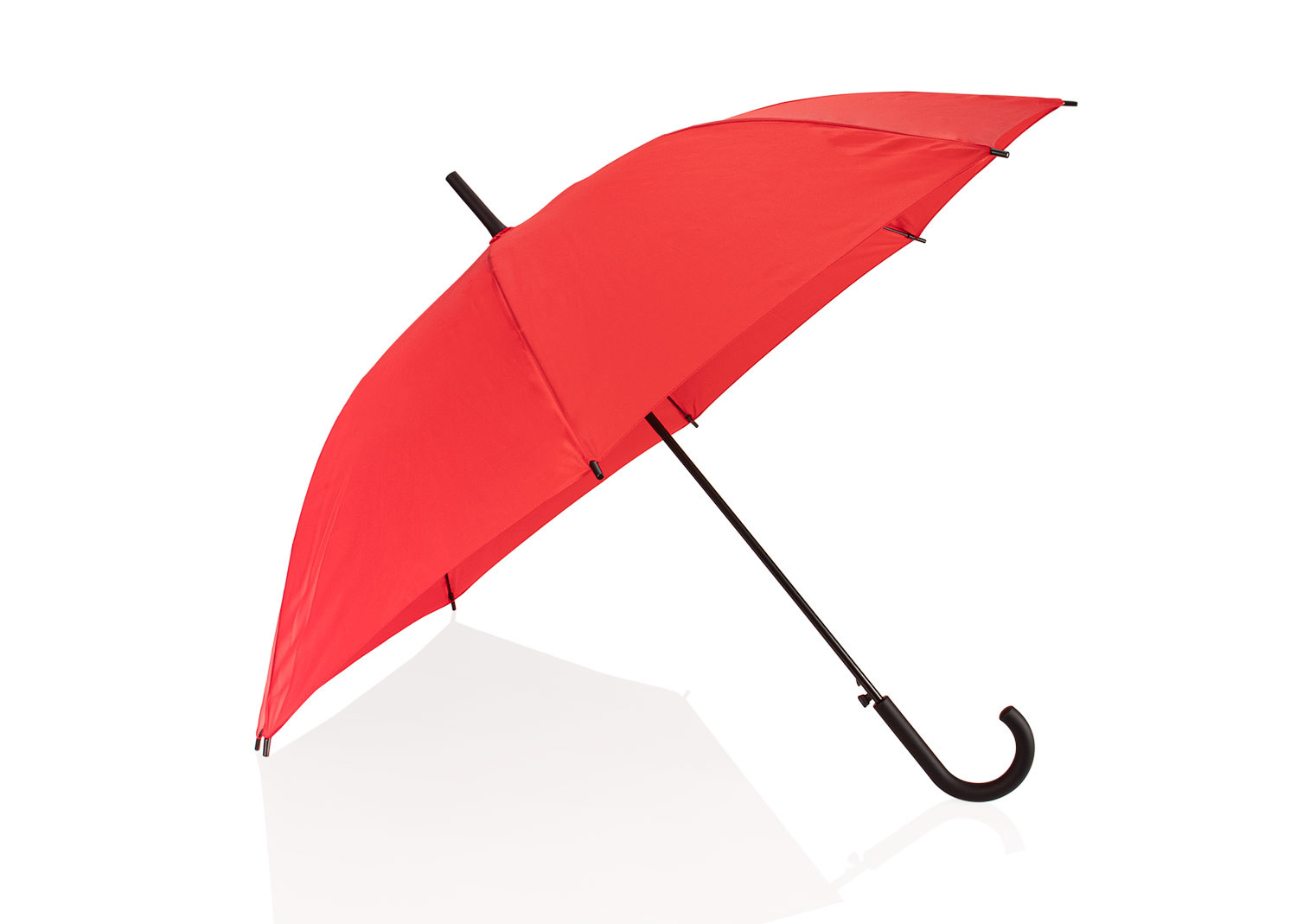 Paraguas tipo recto de 23" con apertura automática. Cuenta con estructura metálica con recubrimiento negro, eje central metálico y varillas largas de fibra de vidrio. Mango curvo en plástico PP con acabado tipo goma (soft touch), en el mismo color de la tela. Incluye puntas y remate superior plásticos.