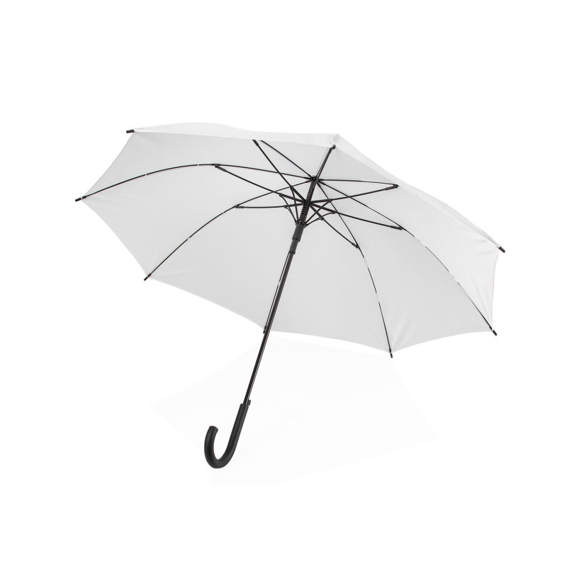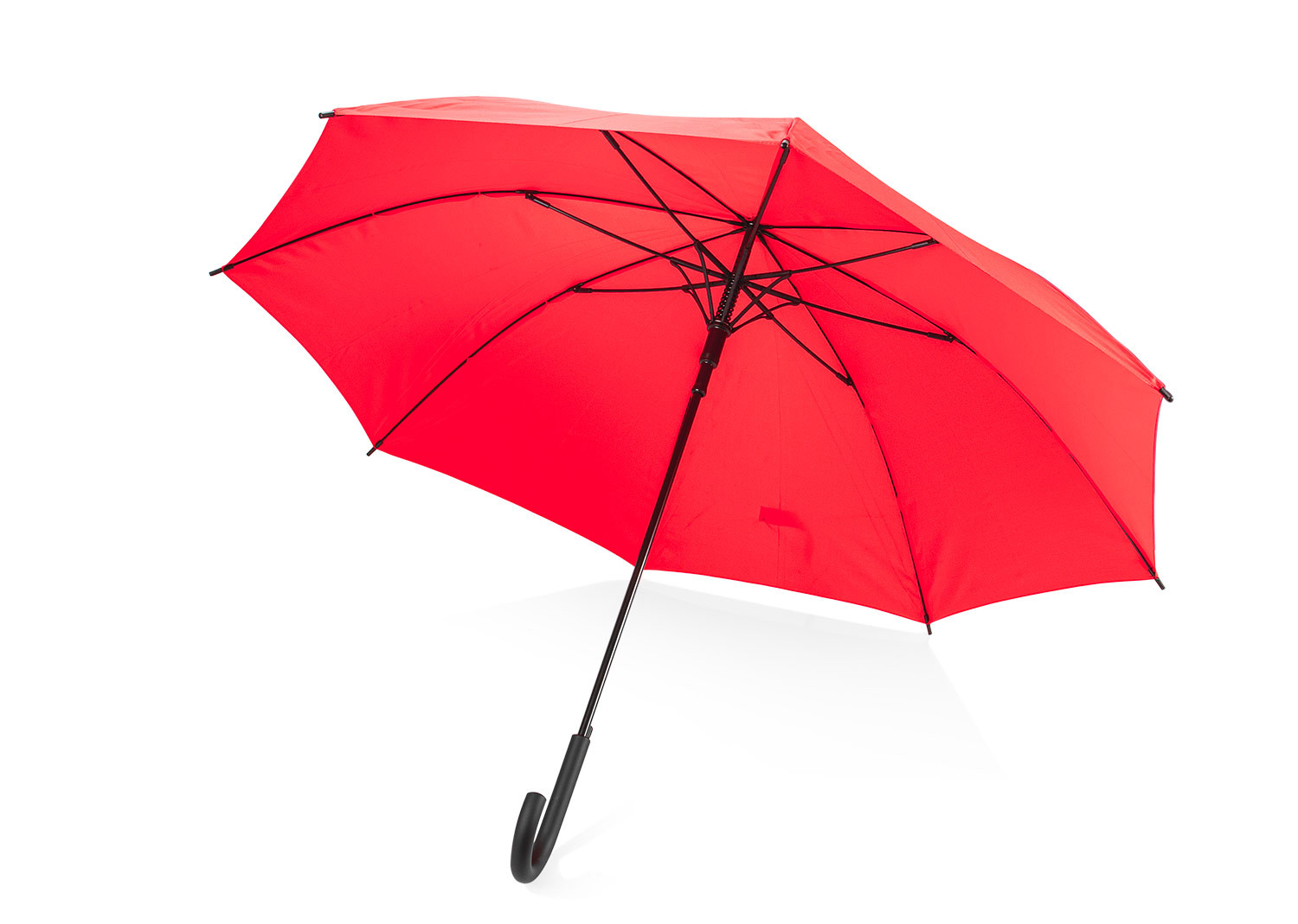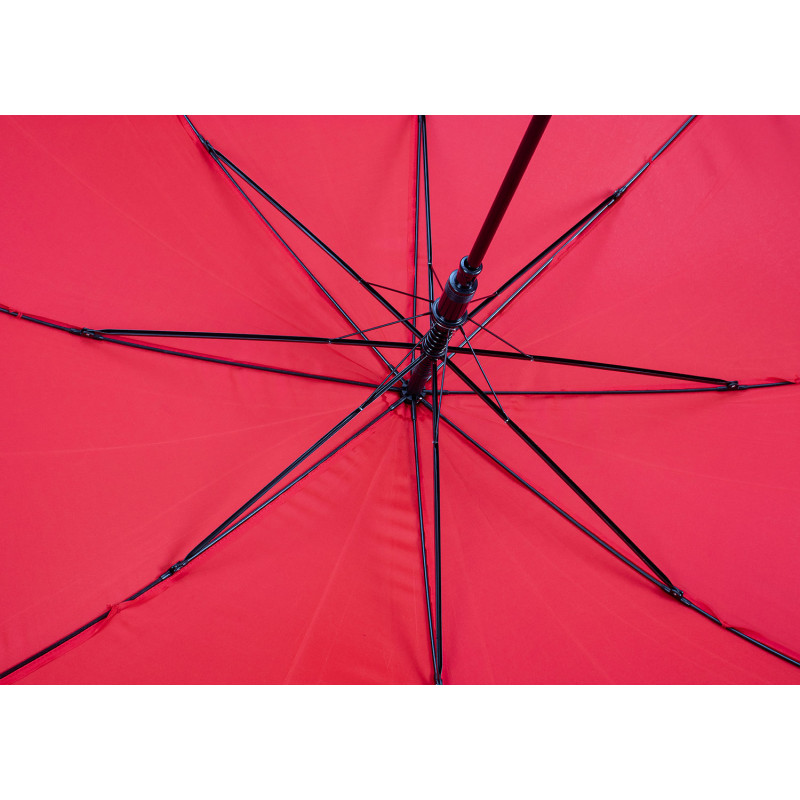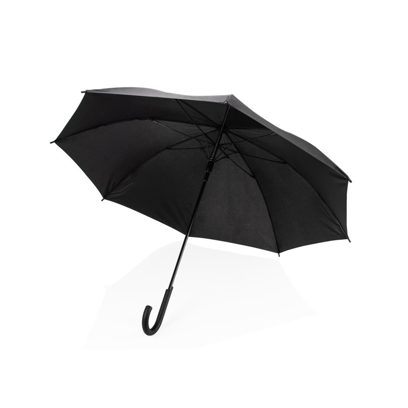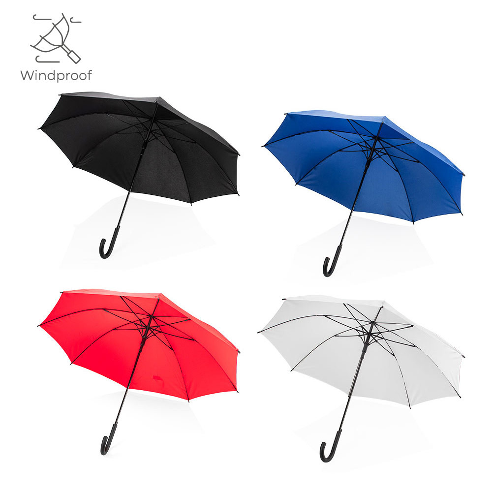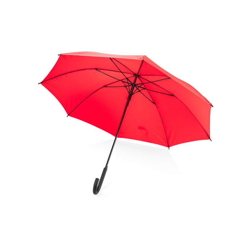 Paraguas tipo recto de 23" con apertura automática. Estructura completa de fibra de vidrio, con eje central de color negro y varillas resistentes. Diseño windproof (resistente al viento) que proporciona mayor estabilidad en condiciones climáticas adversas. Mango curvo de plástico PP con acabado tipo goma (soft touch), en el mismo color de la tela. Puntas y remate superior plásticos.