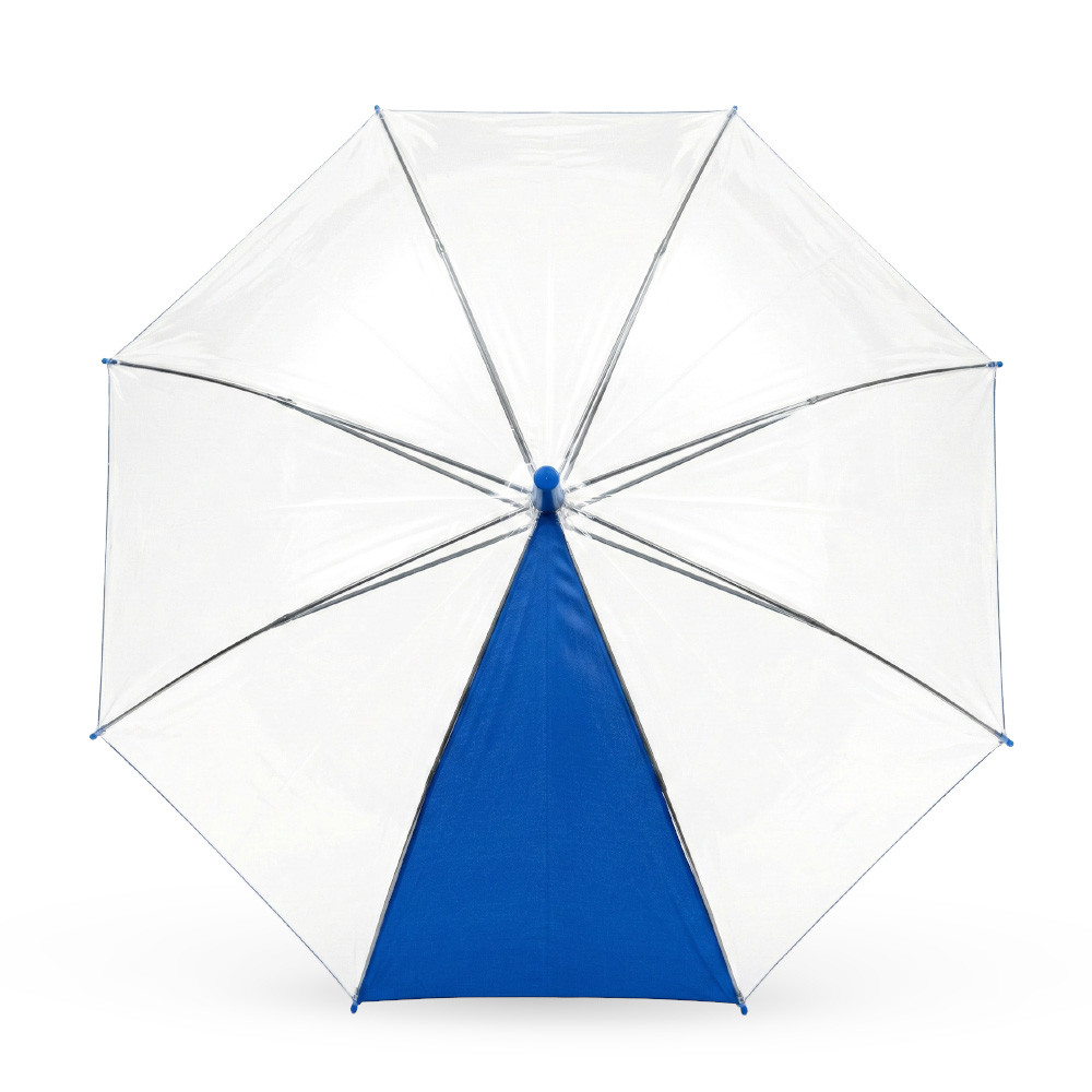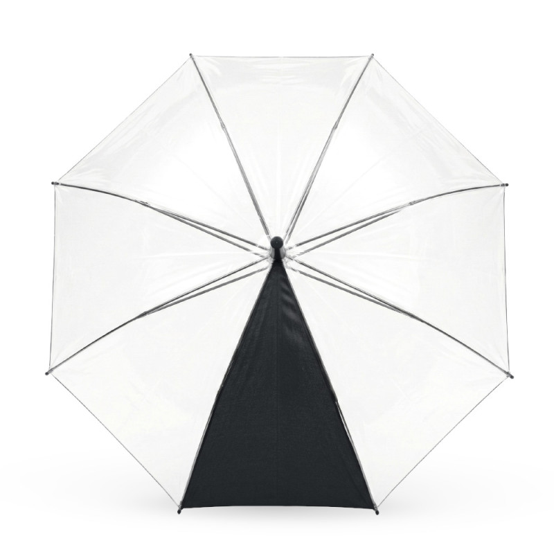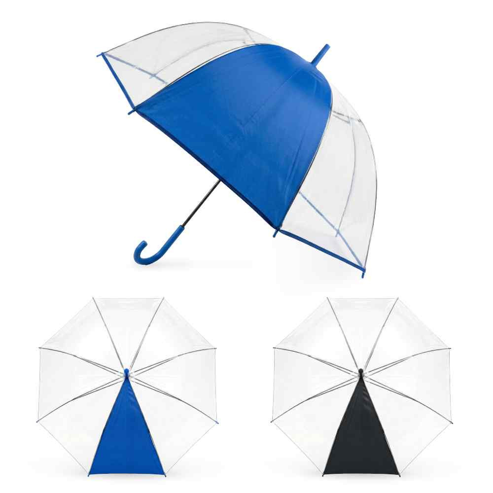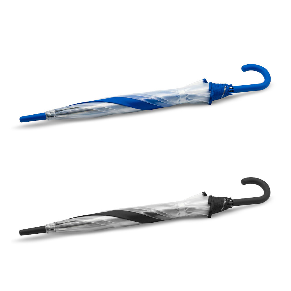 Un panel en poliéster pongee y siete paneles en plástico POE. Paraguas con mayor cobertura y visibilidad al caminar. Apertura y cierre manual. Mango curvo en caucho y herraje metálico con fibra de vidrio.