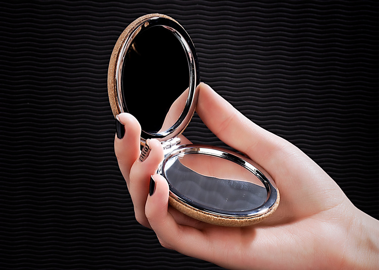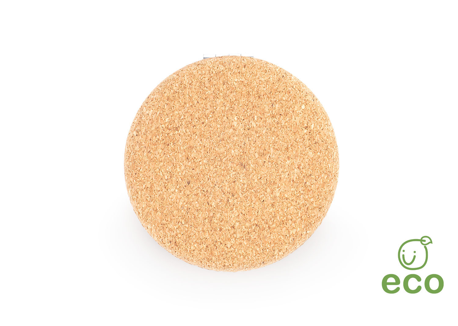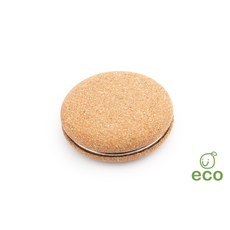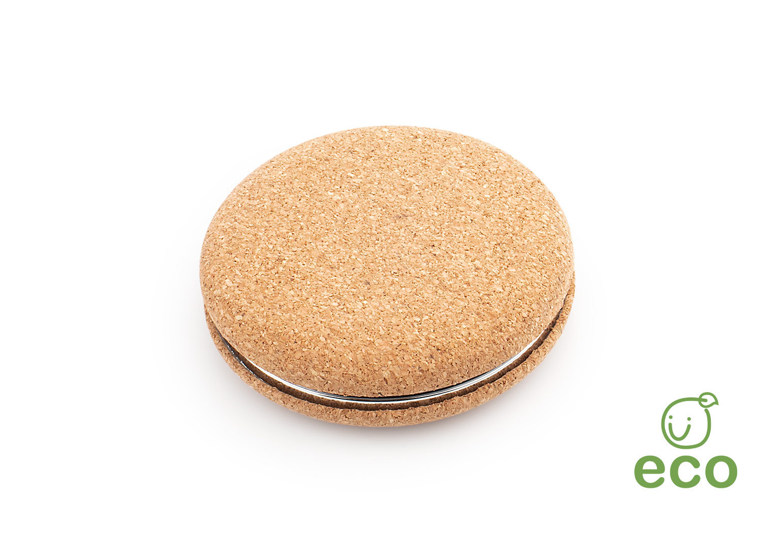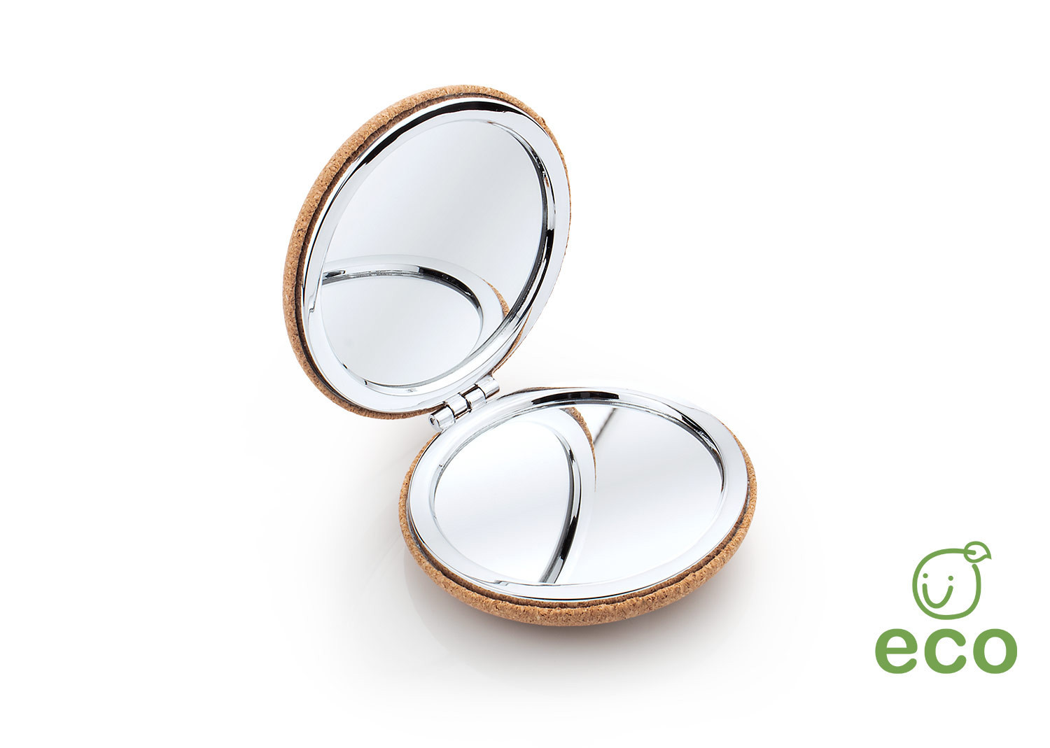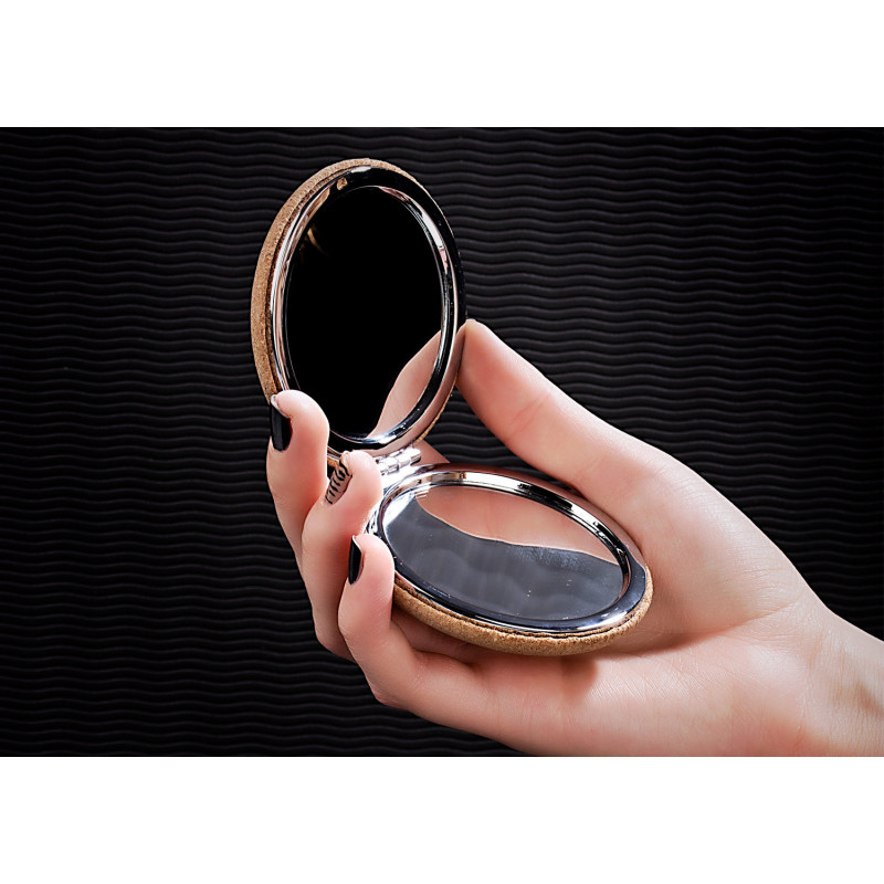 Espejo doble, vista normal y de aumento, cierre imantado. Diseño redondo en corcho.