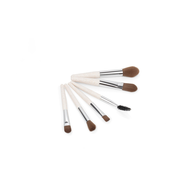 Kit de brochas para maquillaje. Con cerdas suaves y mangos de paja de trigo resistentes. Contiene: Brocha para sombra de ojos (11,7 X 0,5), brocha para difuminar sombras (12,1 X 0,5), brocha para rubor o contorno (12 X 0,8), cepillo para cejas/pestañas (12,6 X 0,5), brocha pequeña angular (11,5 X 0,8) y brocha de precisión o para corrector (11,5 X 0,5).