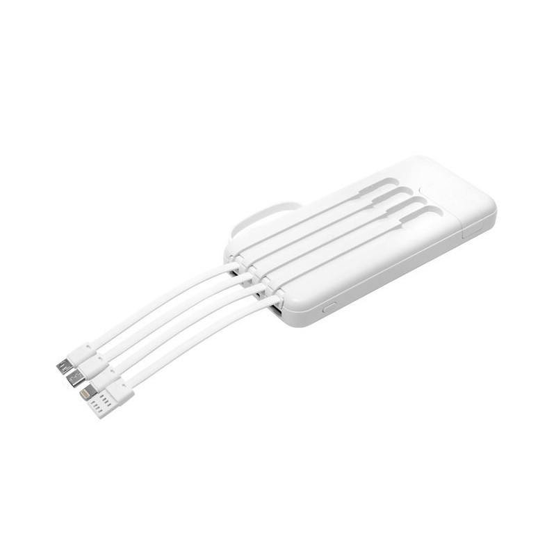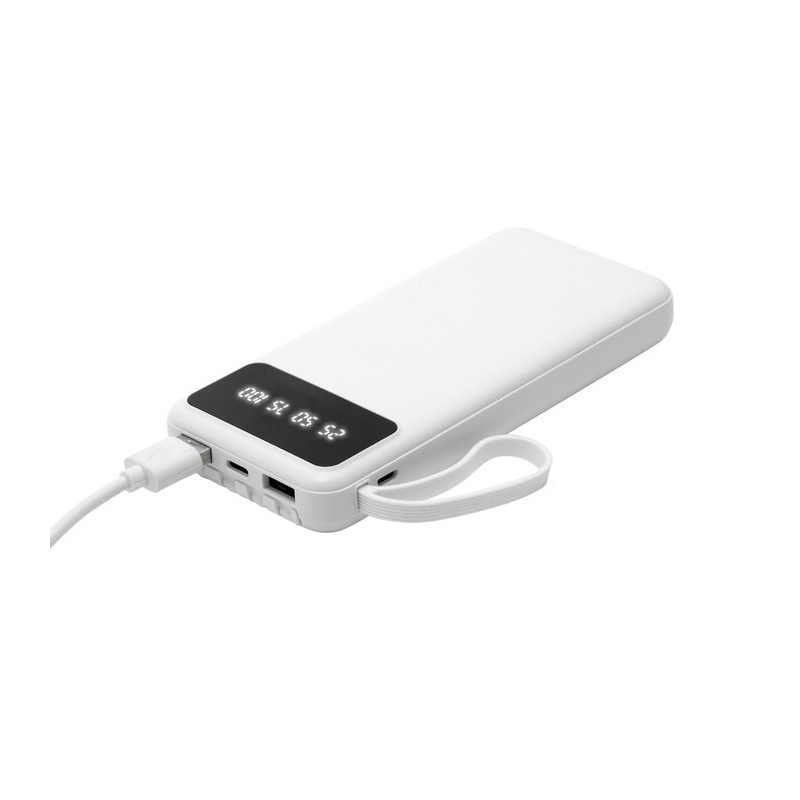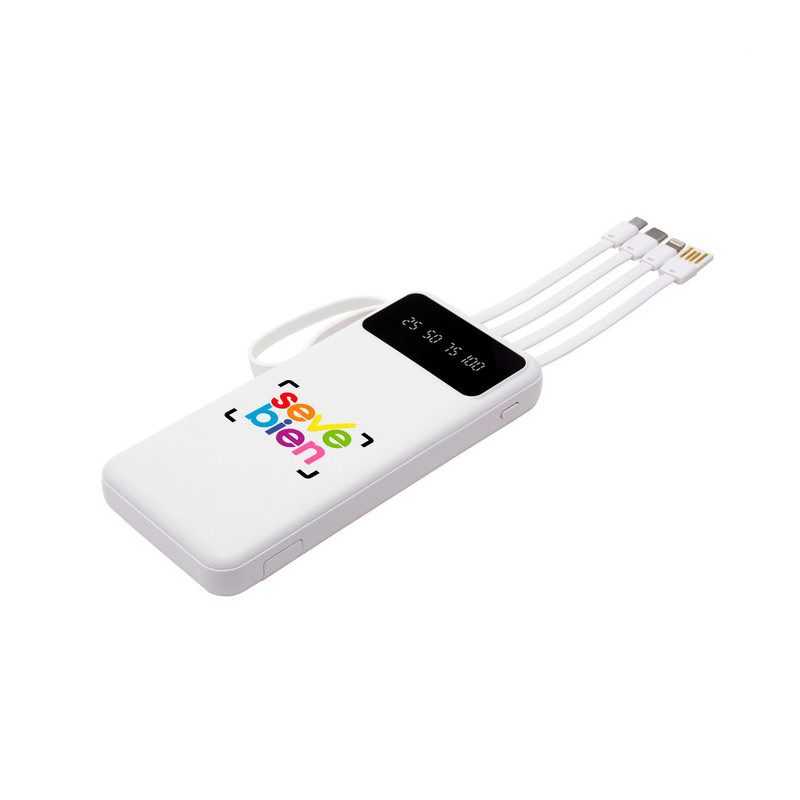 Powerbank multipuerto. Cables de carga incorporados. Entrada: 5V/2A. Salida: 5V/2A. Posee doble entrada tipo C y Micro. 2 salidas USB y 4 cables de carga incorporados: USB, Micro USB, Tipo C y Lightning. Puede cargar hasta 5 dispositivos al mismo tiempo. Display digital con 4 luces led con números. Incluye soporte para celular. Correa de silicona. Presentación en caja de regalo kraft.