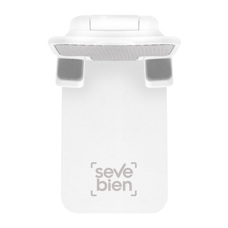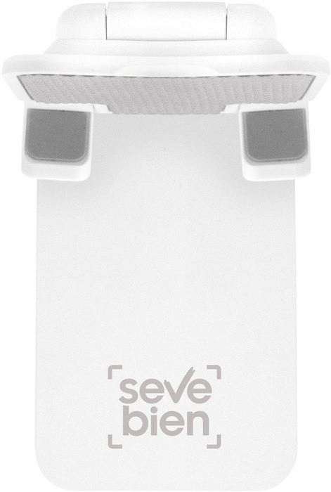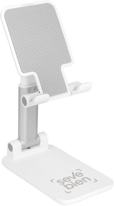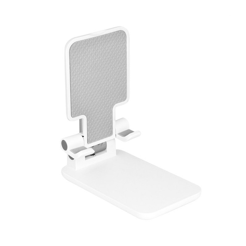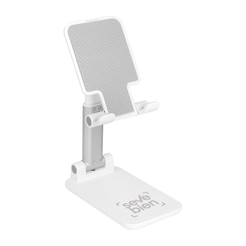 Soporte plegable para móvil. Tiene un sistema extensible de ajuste de altura e inclinación para posicionar el celular. Base con apliques de silicona antideslizantes.