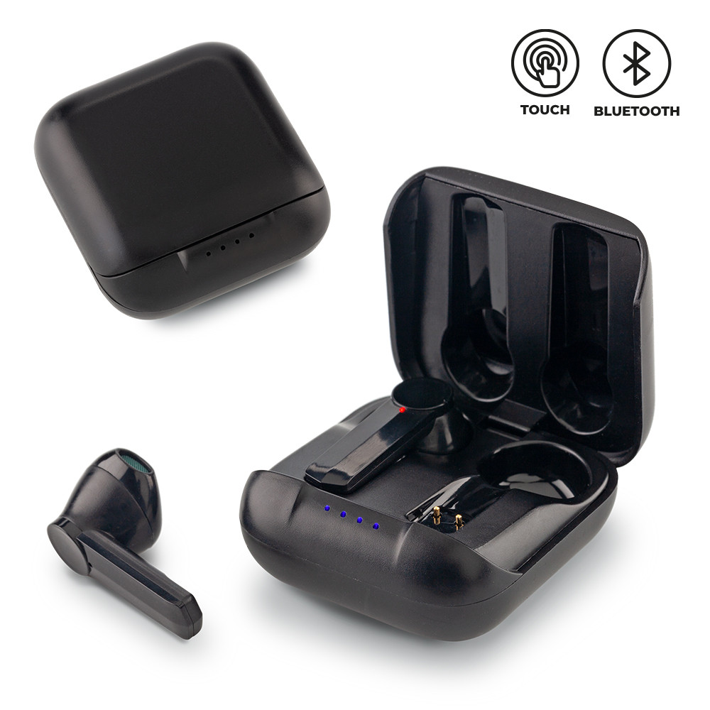 Audífonos Bluetooth plásticos con estuche portátil de recarga. Versión del bluetooth: 5.3. Capacidad de la batería: 300mAh. Mandos por touch. Empaque caja individual.