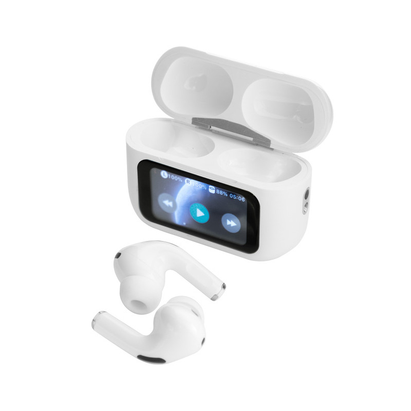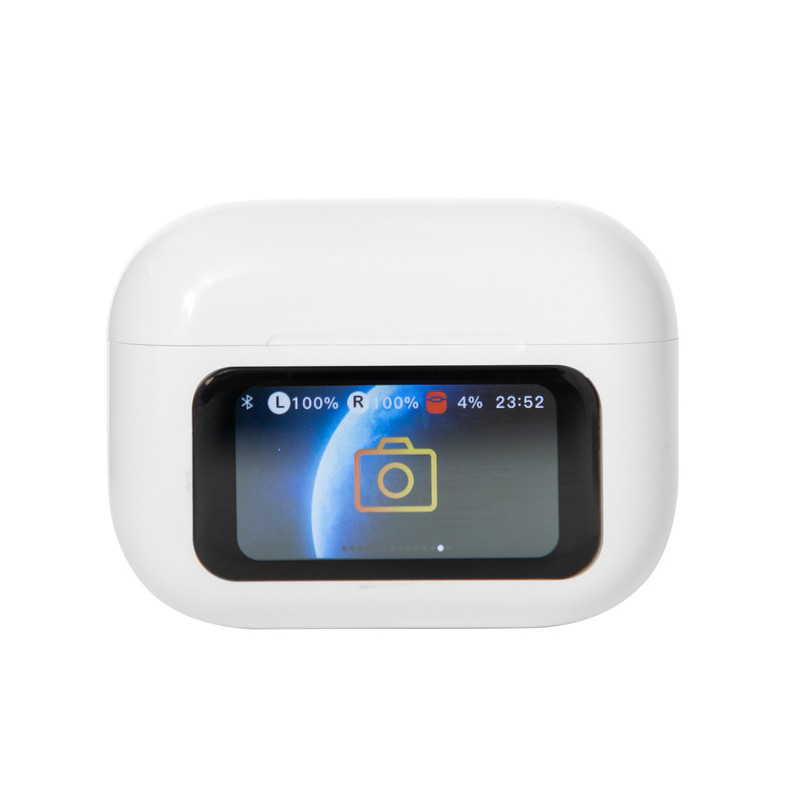 Audífonos bluetooth TWS. Estuche de carga con pantalla táctil multifunción. 14 modos de selección que incluyen disparador para selfies, cronómetro, localizador de auriculares, luz, ecualizador, volumen y cambio de canciones. Encendido automático. 2 micrófonos. Canal doble de sonido. Incluye manual y cable de carga USB-C de 20 cm. color blanco.