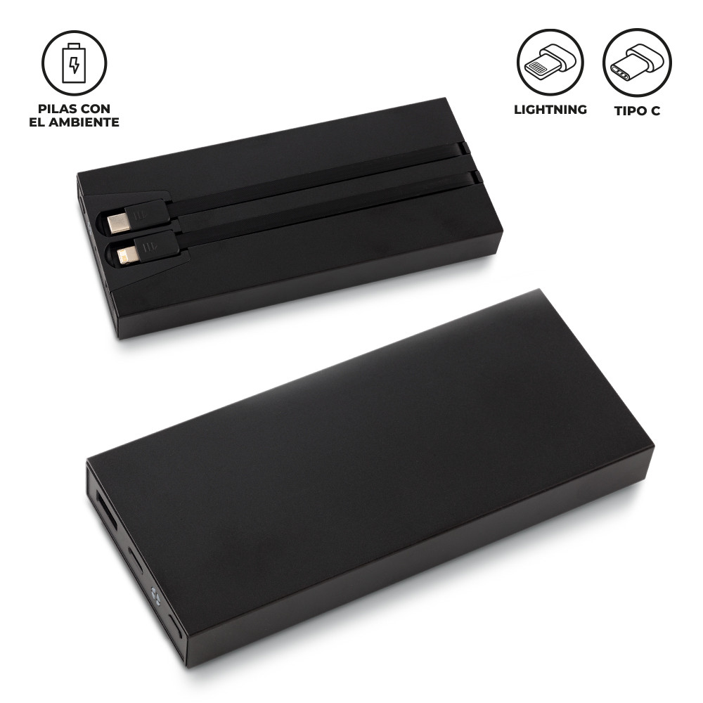 Pila plástica recargable de 10000 mAh. Incluye cable Tipo C y cable Tipo Lightning. Incluye una entrada Tipo C y un puerto USB. Entrada: 5V / Salida: 5V. Incluye 4 luces blancas que indican el 25% de carga cada una. Incluye cable para carga. Empaque caja individual.