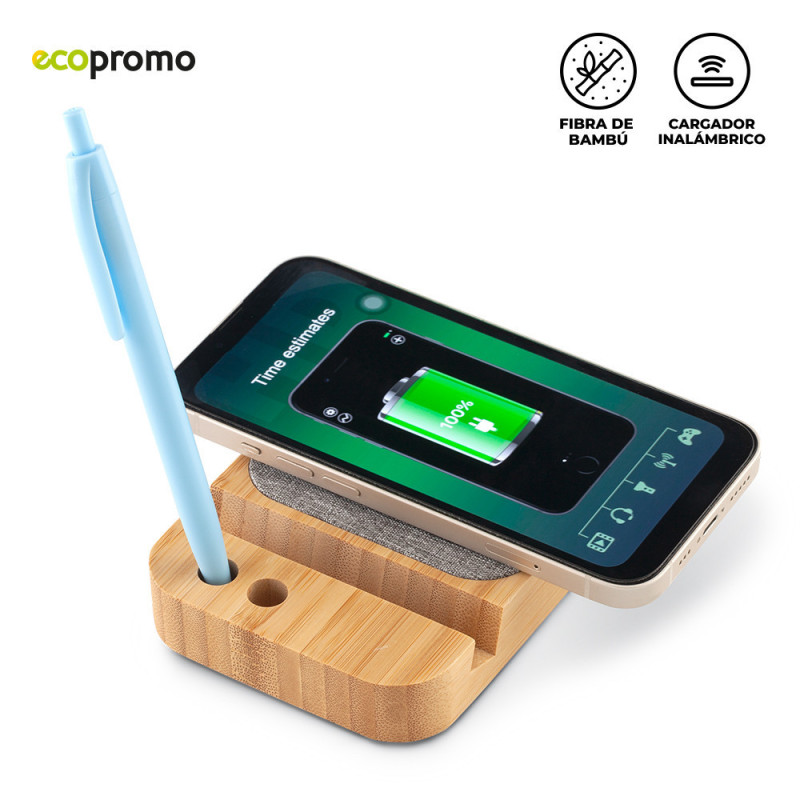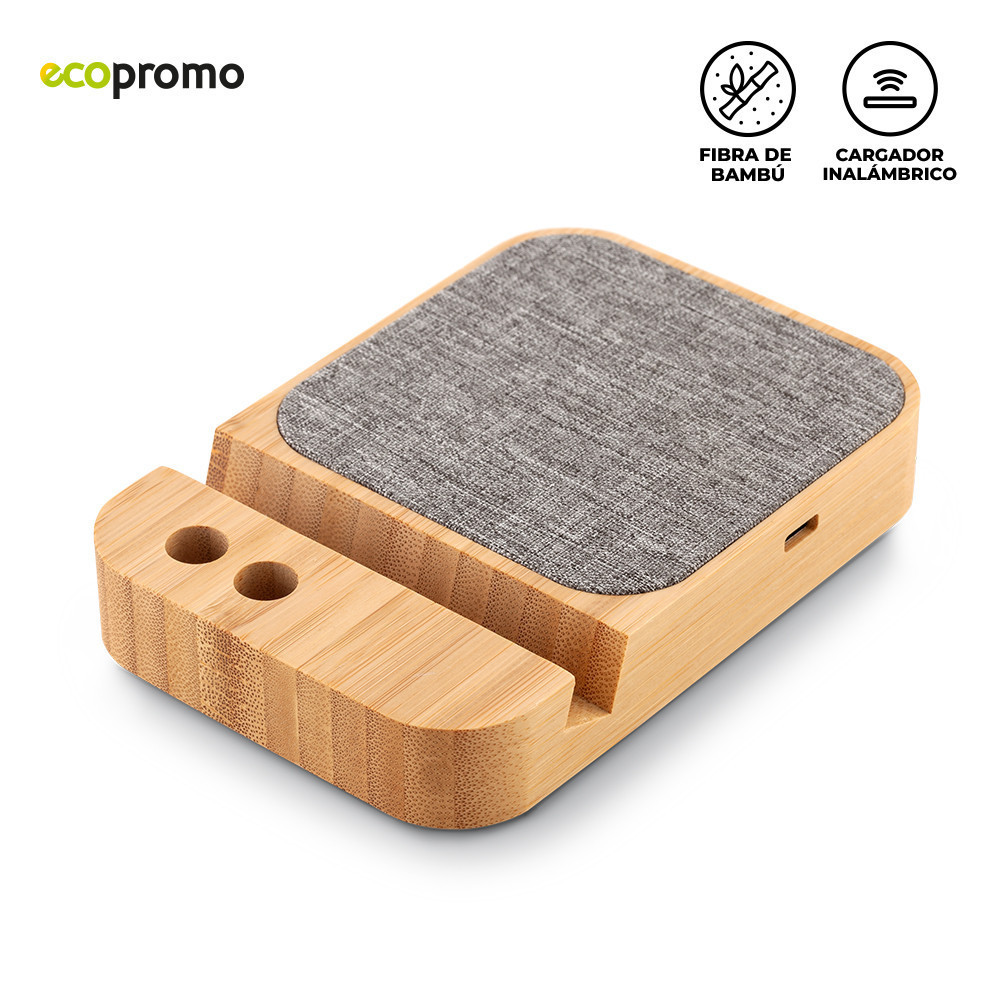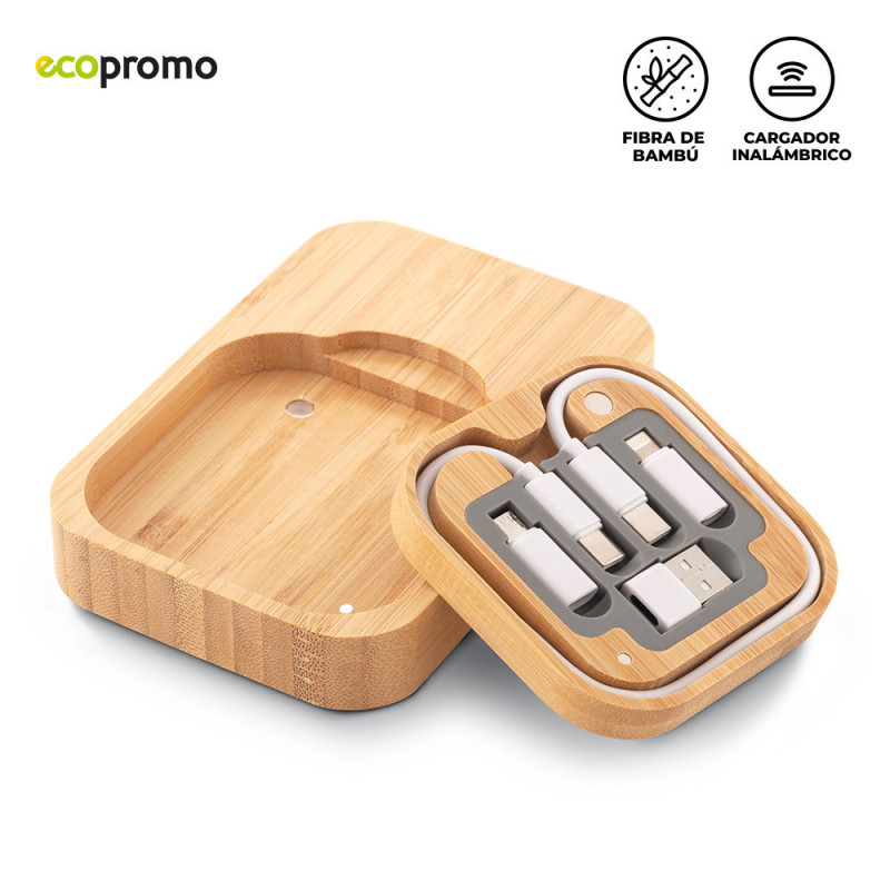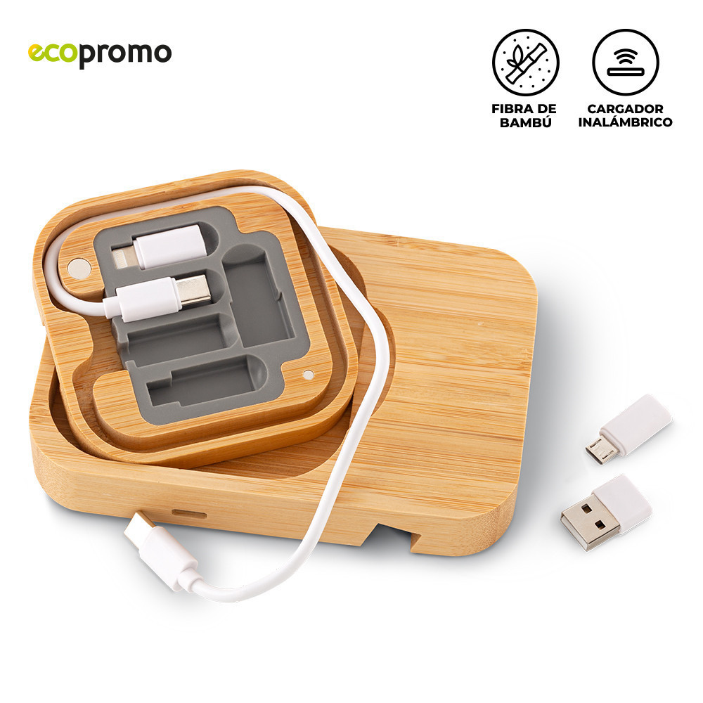 Cargador inalámbrico en bambú y tela. Incluye cable multicargador y tapa con imán. Incluye 1 cable Tipo C y 3 conectores (USB, Micro USB, Lightning). Incluye soporte para celular. Empaque caja individual.