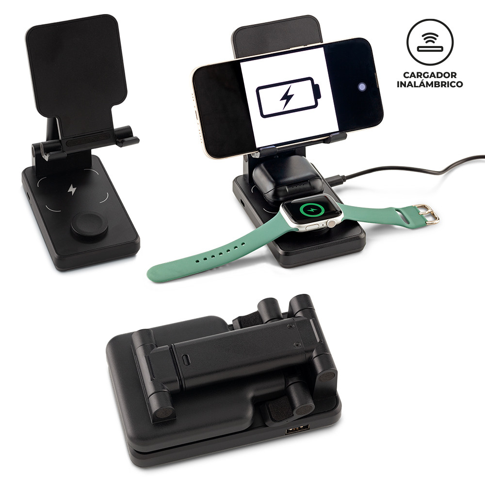 Cargador inalámbrico plástico con soporte plegable y ajustable para celular. Carga teléfonos móviles (15W), audífonos (5W) y relojes Samsung / Apple (2W). Incluye cable Tipo C para carga.