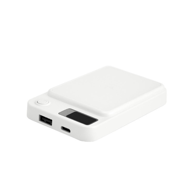 Power bank inalámbrico con aro magnético. Color blanco mate y brillante en la parte delantera. Posee indicador digital de capacidad. Entrada y salida: 5V 2A. Con 1 puerto de carga y función inalámbrica magnética. Potencia inalámbrica: 5W. Cable de carga USB - C en color blanco. Anillo magnético extra para pegar en la parte trasera del teléfono móvil.