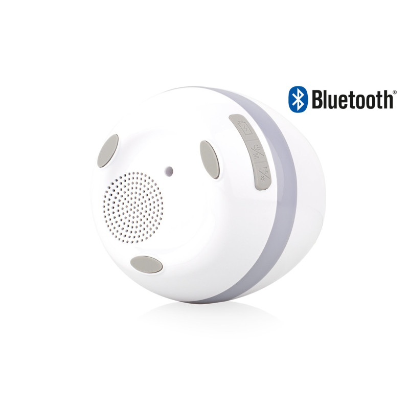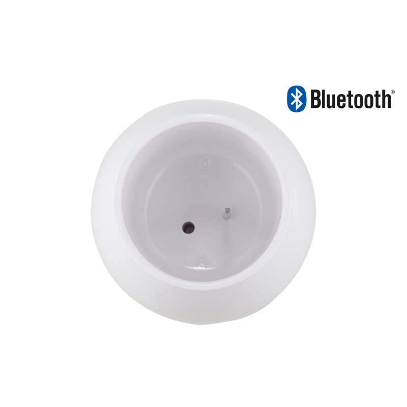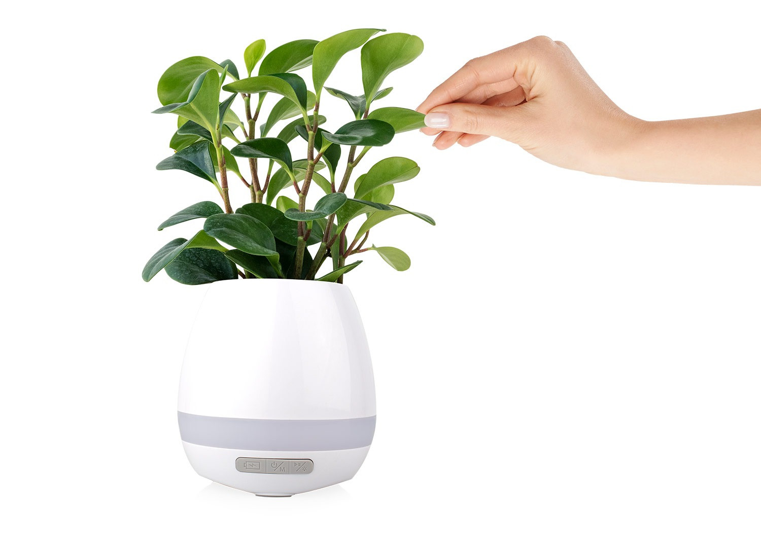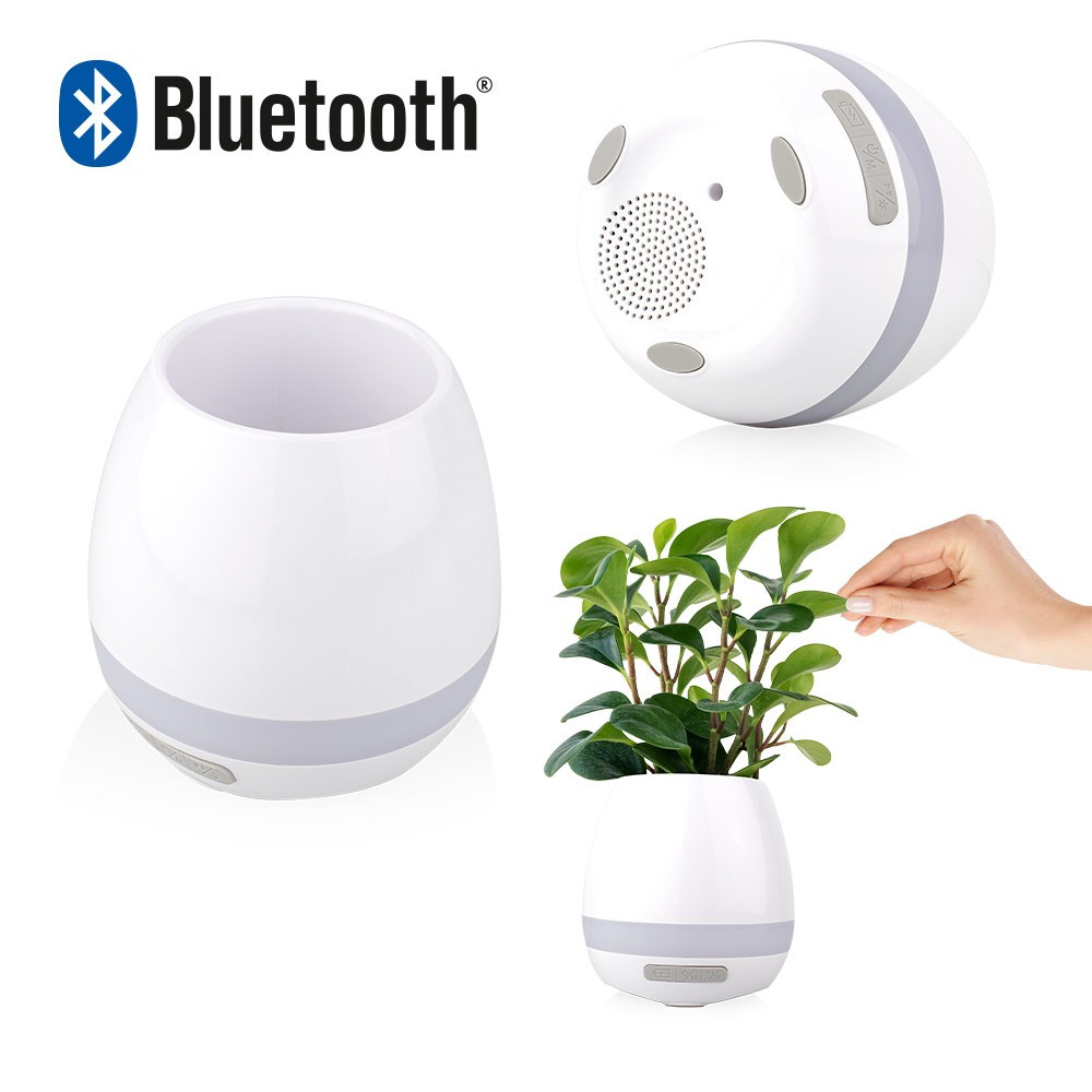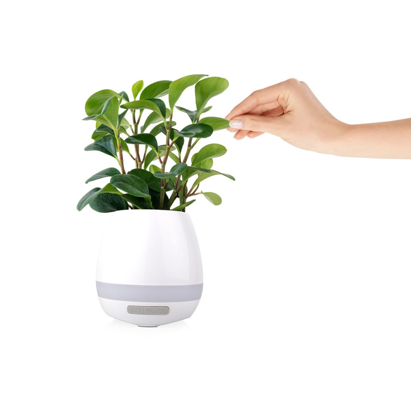 Altavoz Bluetooth con diseño multifuncional que incluye luz LED decorativa y maceta con sensores táctiles que permiten reproducir sonidos al tocar la planta; cuenta con puerto micro USB para carga, botón de control de iluminación con 7 colores disponibles, y diseño inferior con salida de agua para mantener la planta en buen estado. Ofrece conexión Bluetooth 5.0 con alcance de hasta 10 metros, altavoz de 5W, batería de 1,200 mAh con hasta 12 horas de reproducción, y controles básicos para reproducción, encendido/apagado y cambio de modo.
