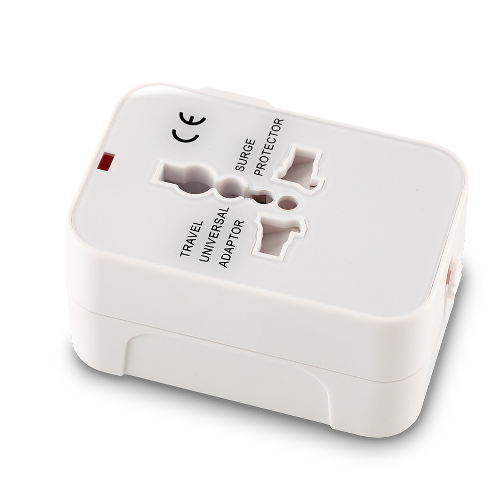 Adaptador de corriente en plástico para viajes, con un puerto USB de 2.4 A y un puerto Tipo C de 2.4 A. Permite cargar 3 dispositivos simultáneamente. No es un convertidor de voltaje. Empaque caja individual