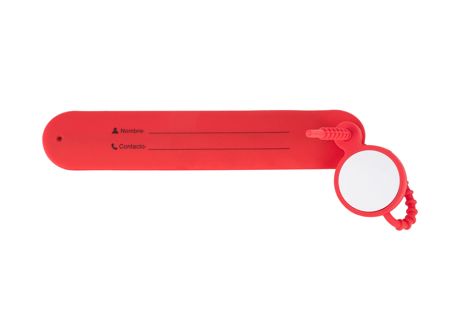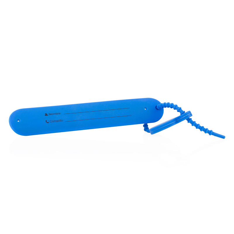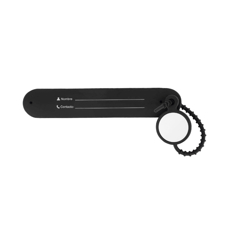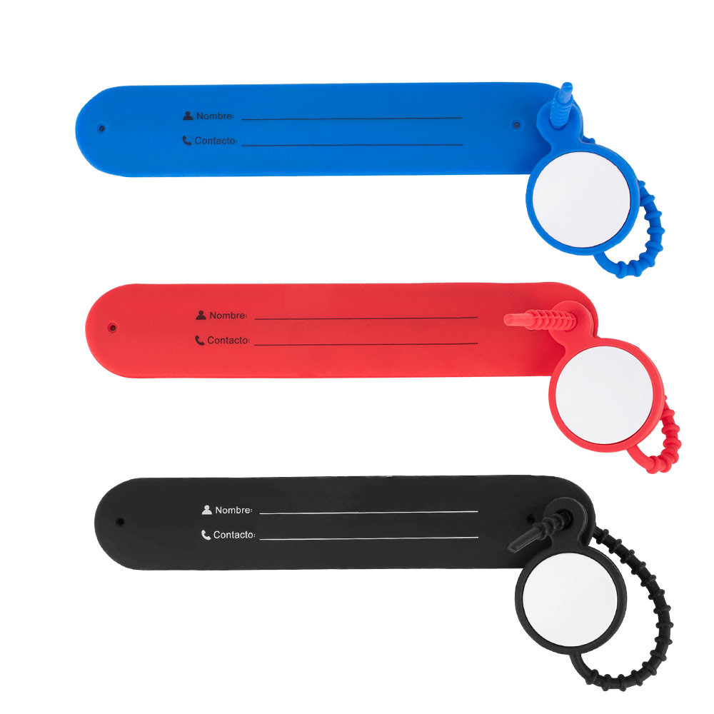 Etiqueta de equipaje fabricada en silicona flexible, diseñada para resistir el uso constante y brindar comodidad. Incluye espacio para inscripción de nombre y datos de contacto, asegurando una identificación clara. Su diseño permite que el identificador se encoja y recupere su forma original, con un sistema de ajuste seguro y adaptable para sujetarlo firmemente a maletas o bolsos. Ideal para viajes prácticos y organizados.