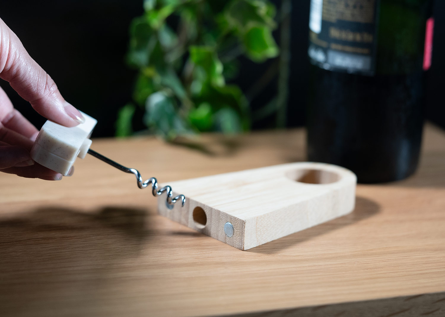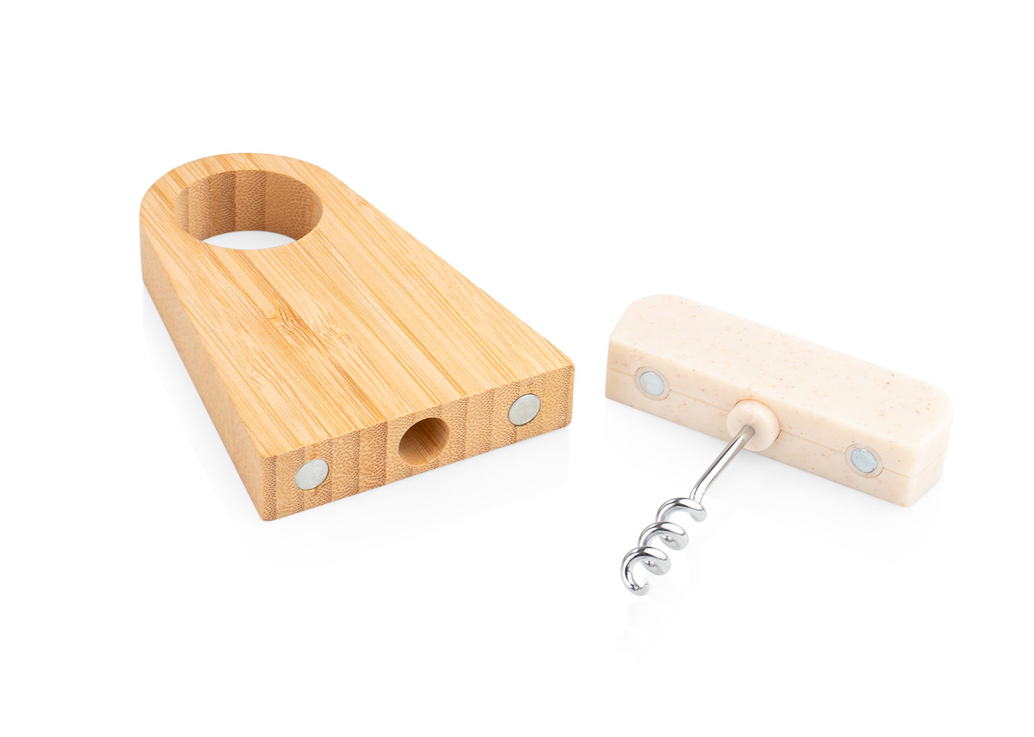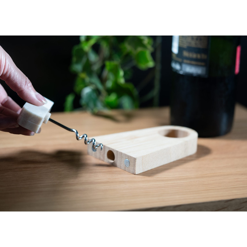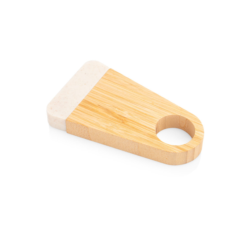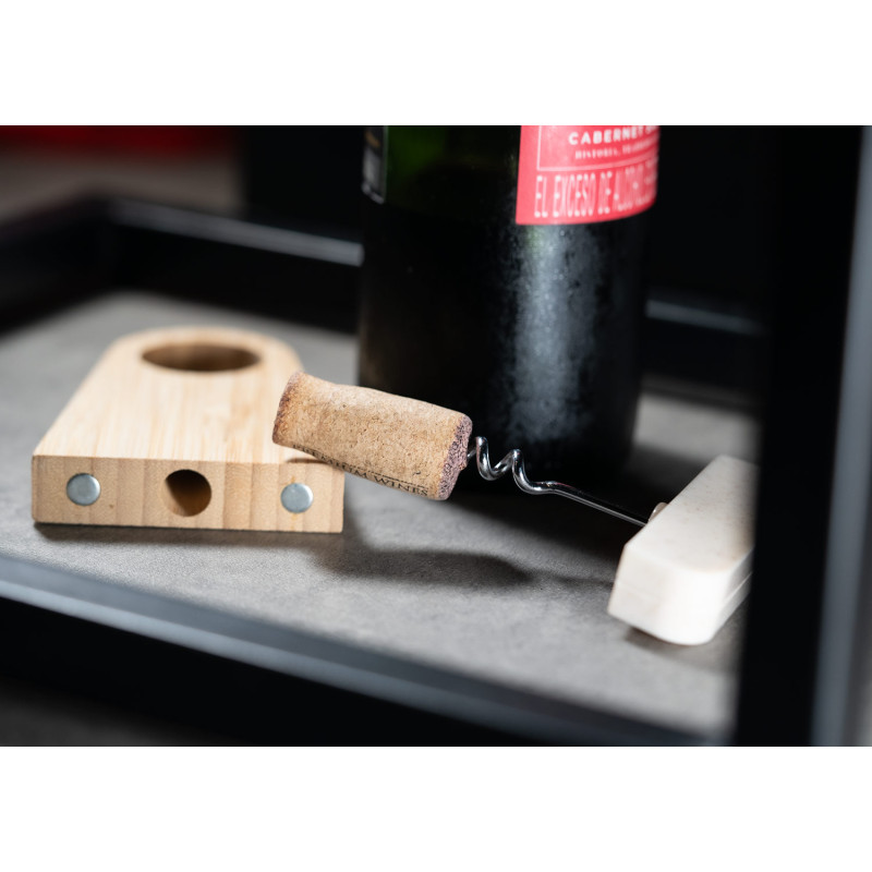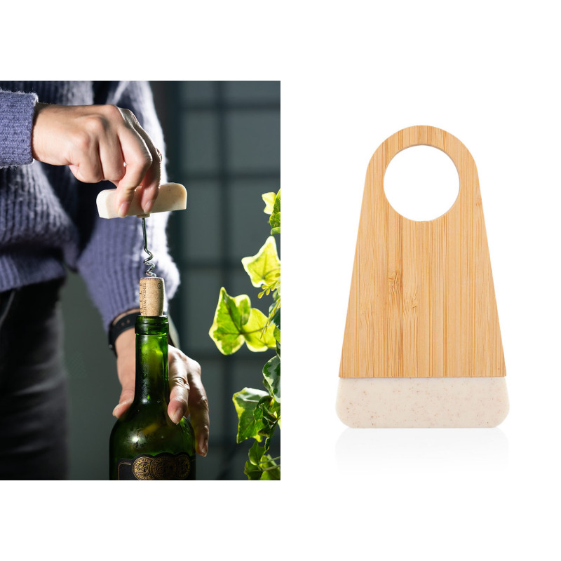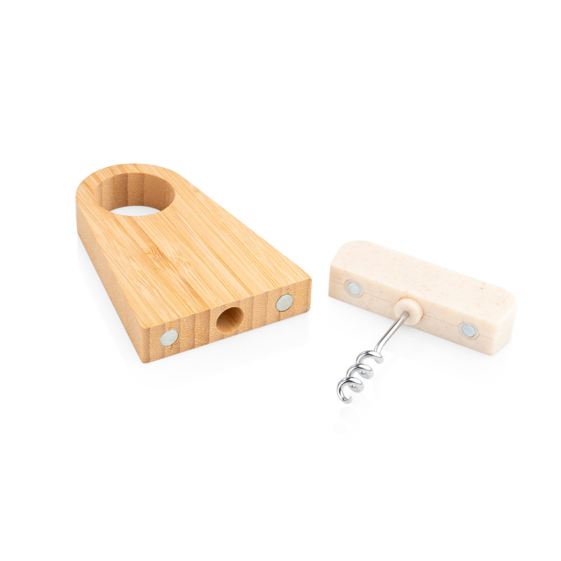 Elegante soporte de bambú que incluye un abridor de botellas elaborado en fibra de paja de trigo. Ambos elementos se mantienen unidos gracias a un imán integrado.
