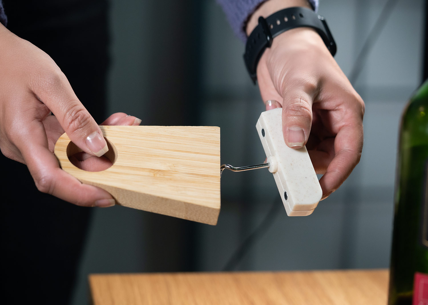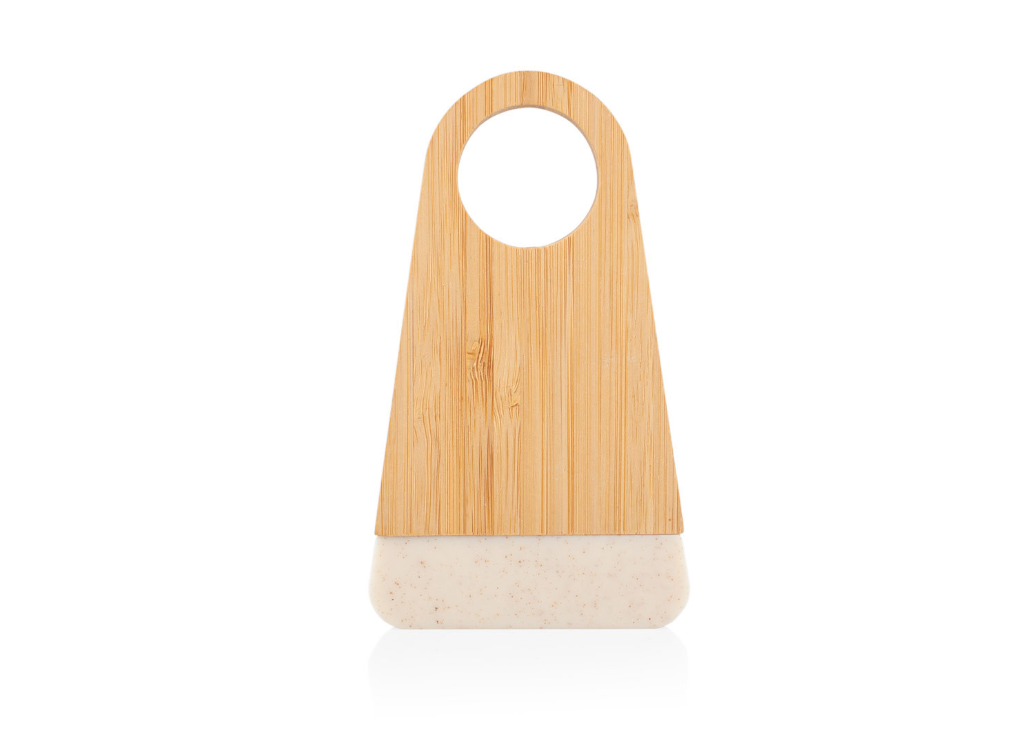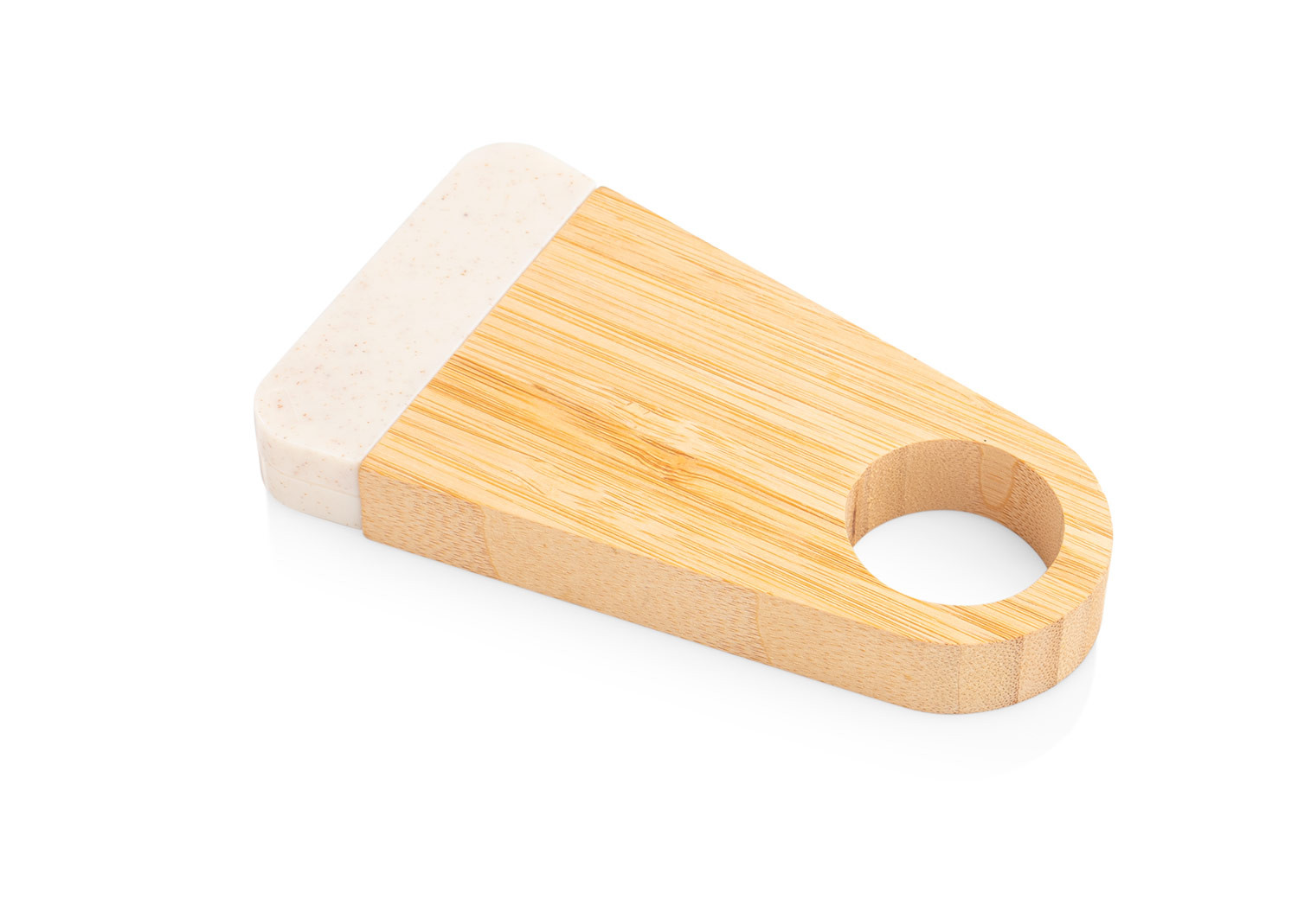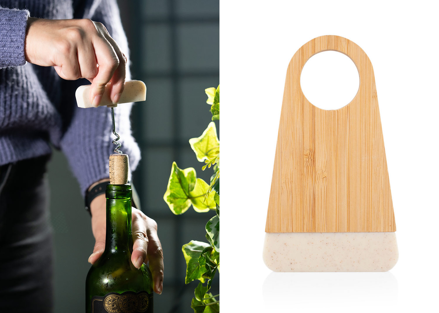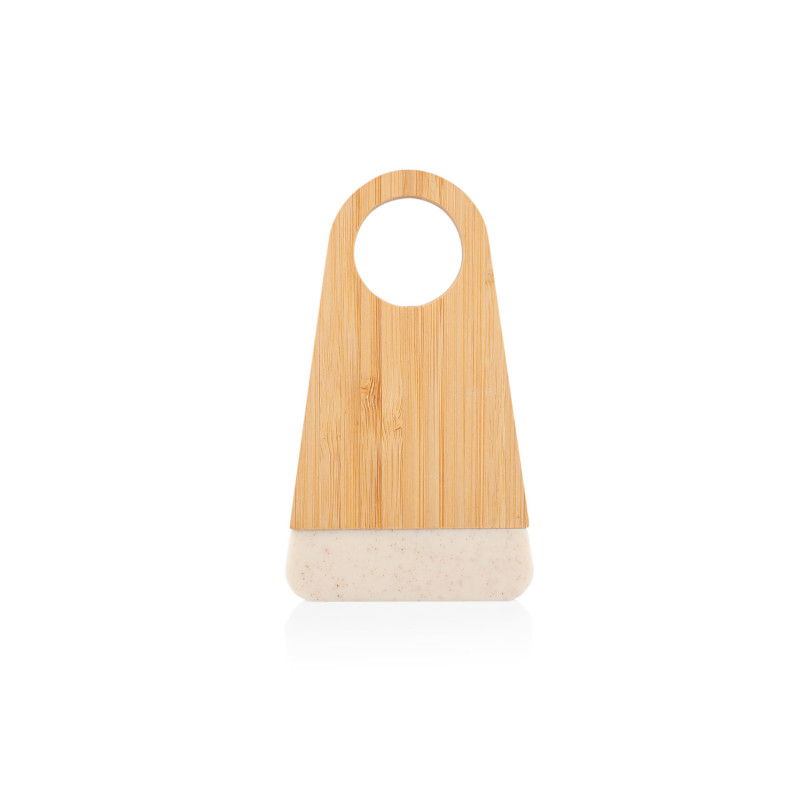 Elegante soporte de bambú que incluye un abridor de botellas elaborado en fibra de paja de trigo. Ambos elementos se mantienen unidos gracias a un imán integrado.