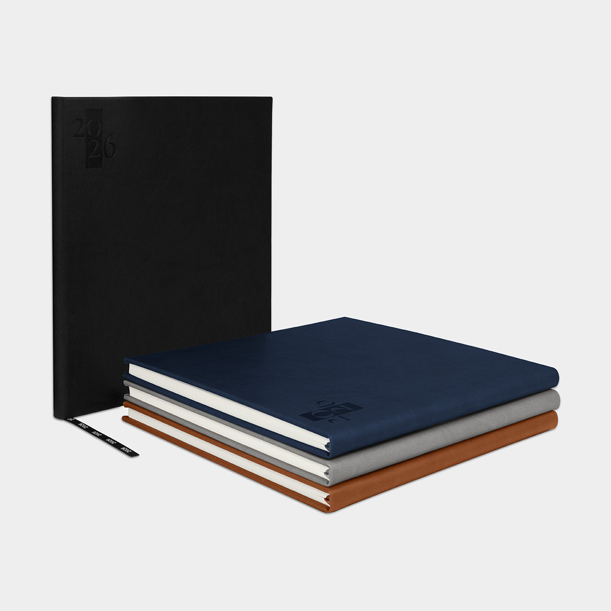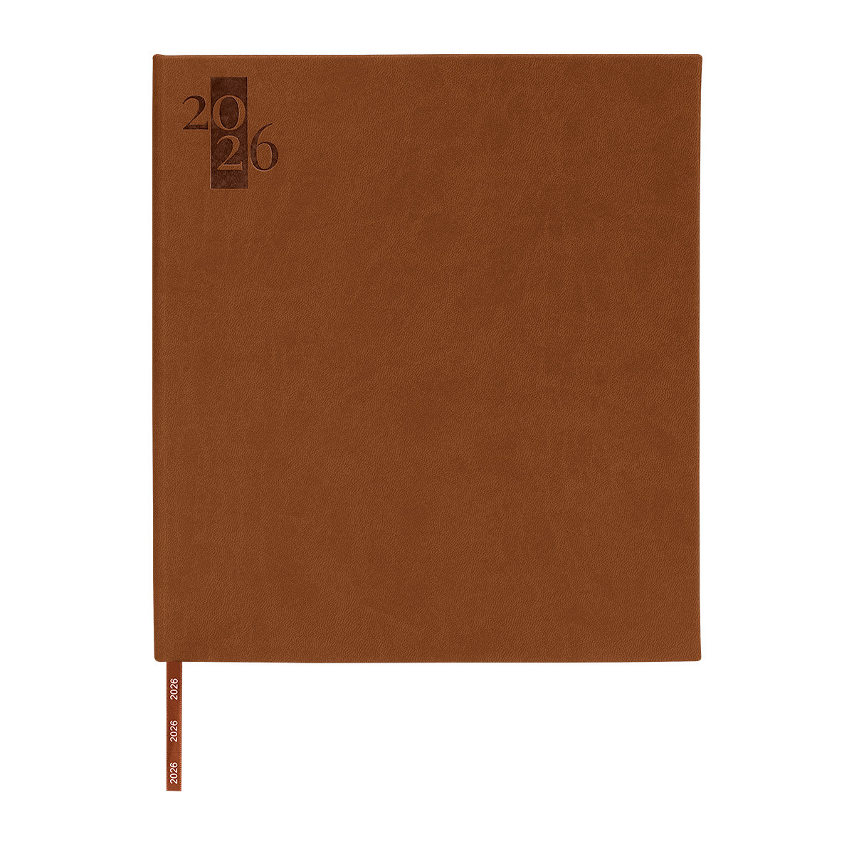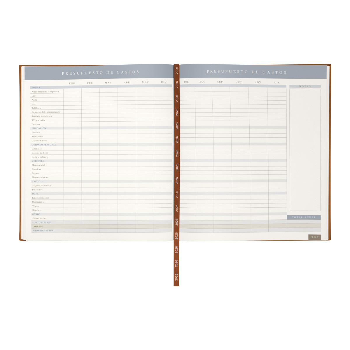 Agenda semanal con 80 hojas. Contiene datos personales, calendarios 2025-2026-2027, planeador 2026, presupuesto de gastos, seguimiento de nuevos habitos, organizador de tareas, planeador de proyecto. Incluye caja individual.