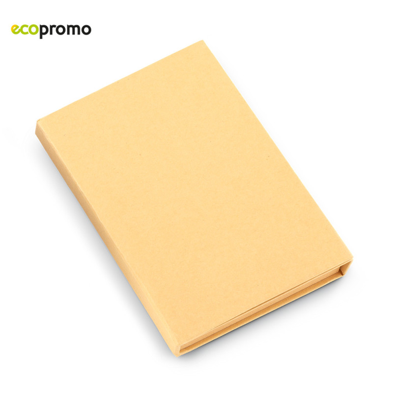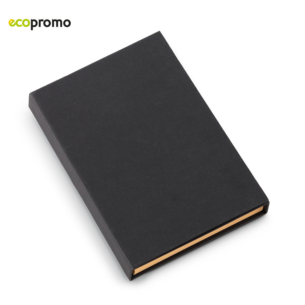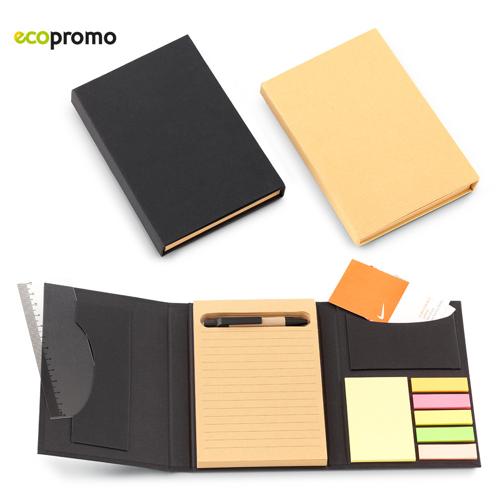 Libreta en cartón, 80 hojas rayadas recicladas. Mini esfero ecológico en cartón. 5 stickies en colores surtidos y 1 taco de papel para tomar notas. Una regla de 12 cm. Un portatarjetas.