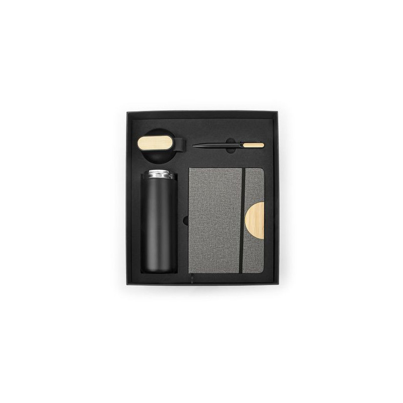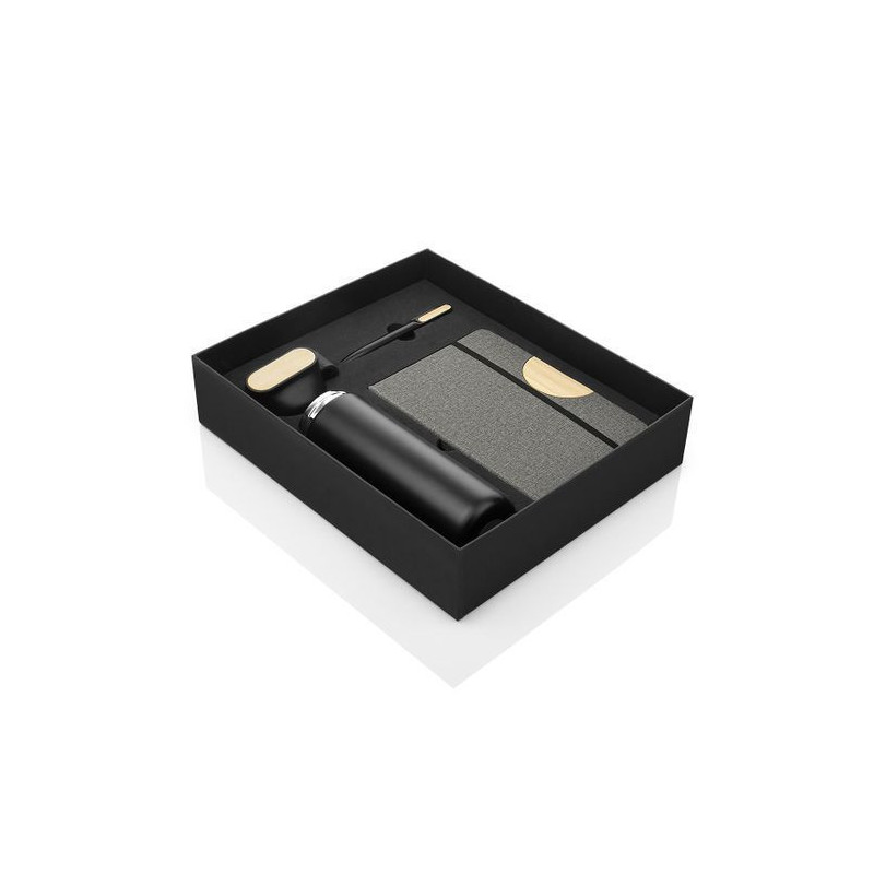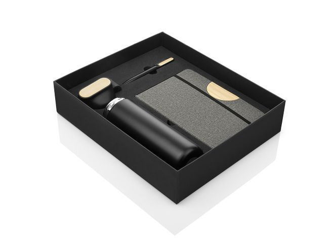 Set Ejecutivo Nexus, Set ejecutivo con estuche de lujo. Incluye bolígrafo en aluminio con sistema twist, Libreta con 80 hojas rayadas, banda elastica de cierre lateral, cinta marcadora y portabolígrafo. Mug de 600 ml / 20 Oz en acero inoxidable con tapa rosca y banda de silicona para transportar con facilidad. los 3 elementos tienen un detalle en Bambú para marcar en laser.