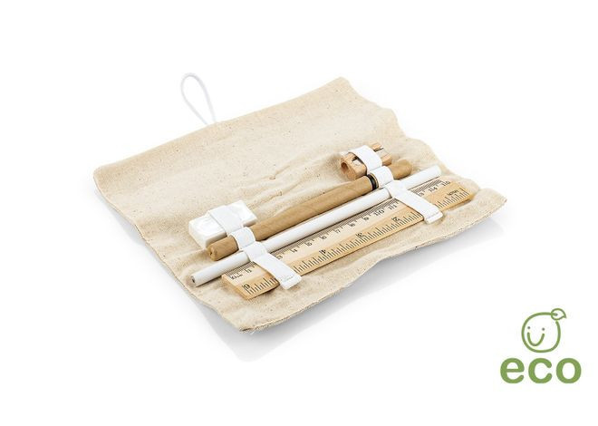 Set escritorio ecologic, Set de escritorio en estuche de algodón. Incluye bolígrafo con tapa y tinta negra, borrador, lápiz, tajalápiz y regla de 15 cm ó 6 Pulgadas.