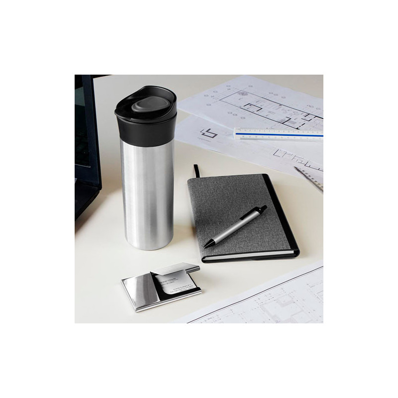 Incluye termo de doble pared con válvula de seguridad, tarjetero con acabado cromado (posición vertical), bolígrafo de aluminio y caja de regalo.