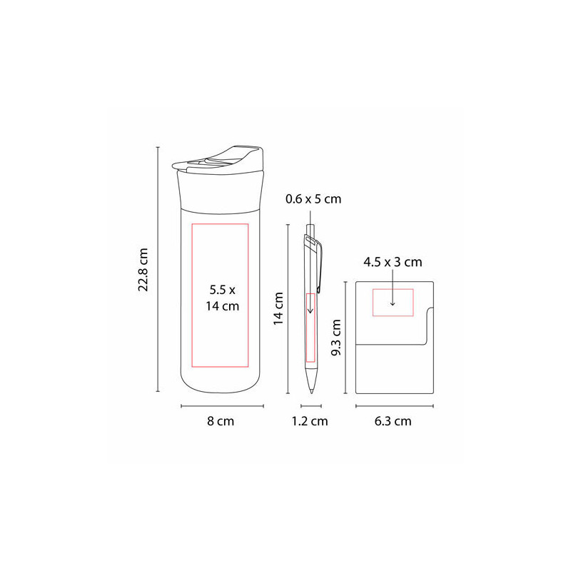 Área de impresión: 5.5 x 14 cm Termo / 0.6 x 5 cm Bolígrafo / 4.5 x 3 cm Tarjetero