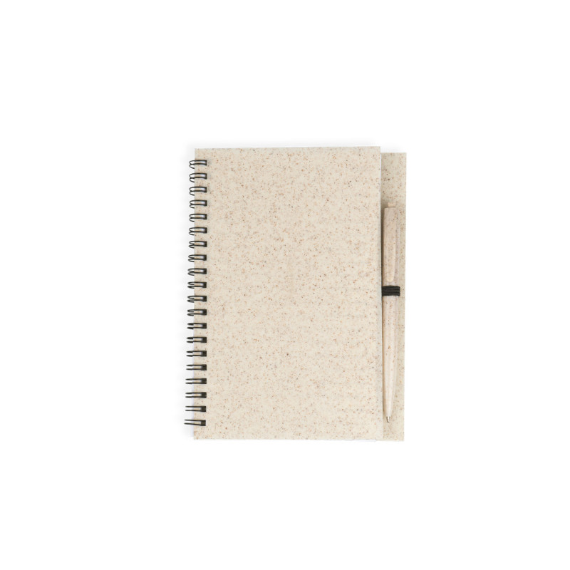 Libreta argollada 'doble O' con cubierta elaborada en paja de trigo, 80 hojas rayadas. Tamaño aproximado de la hoja: A6. Incluye bolígrafo elaborado en paja de trigo.