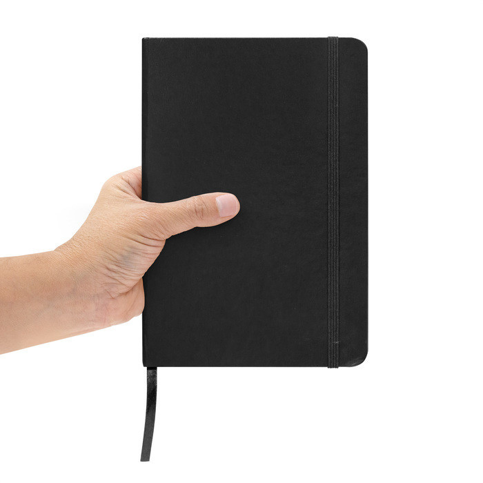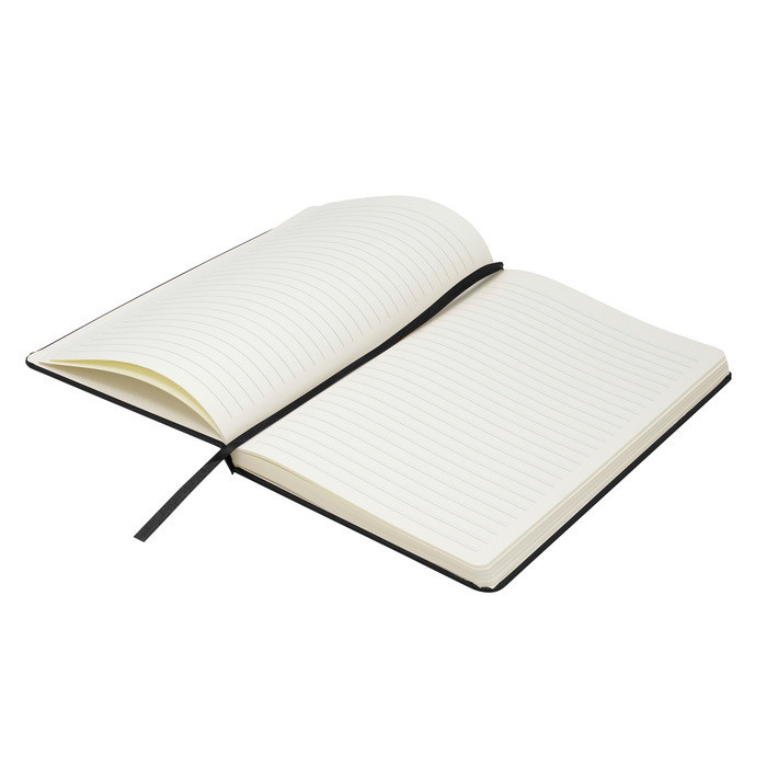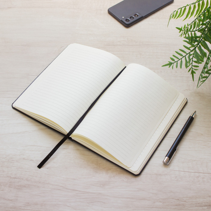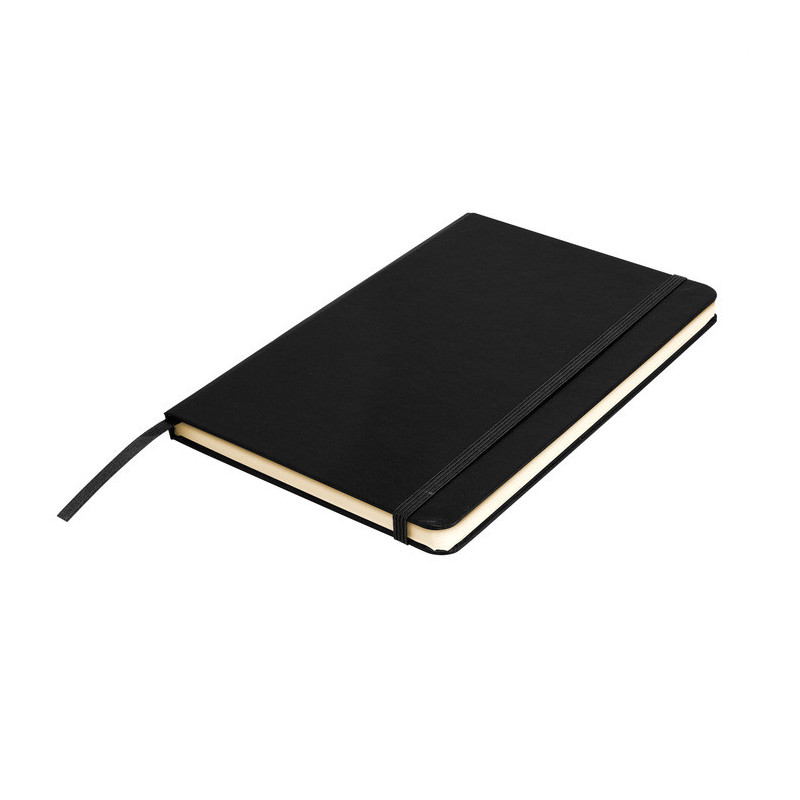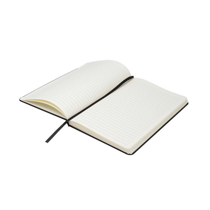 Mantén tus ideas organizadas. Libreta. Tapa de cartón de 300g recubierta en poliuretano de diferentes colores. Interior de 80 hojas rayadas en papel obra crema de 70g. Encuadernación cosido. Incluye cinta señaladora del color de la tapa. Cierre con banda elástica del mismo color.