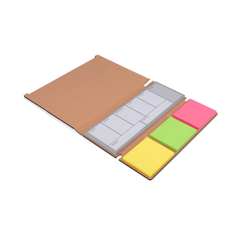 Planifica y organiza con elegancia. Este cuaderno A5 combina funcionalidad y diseño, con cubierta en PU que aporta resistencia y estilo. Incluye pegatinas adhesivas (6,3 X 5,5) en tres colores para resaltar tus ideas, y un anotador (20,4 X 6,9) con los días de la semana y espacio para notas, ideal para mantener tus tareas bajo control. Las pegatinas están elaboradas en papel de 70 g/m², garantizando calidad y durabilidad. Además, viene acompañado de un bolígrafo (14,1 X Ø 0,8 X 1,1) con clip y mecanismo retráctil, listo para acompañarte en tu día a día. ¡Un set completo para quienes buscan practicidad y presentación!