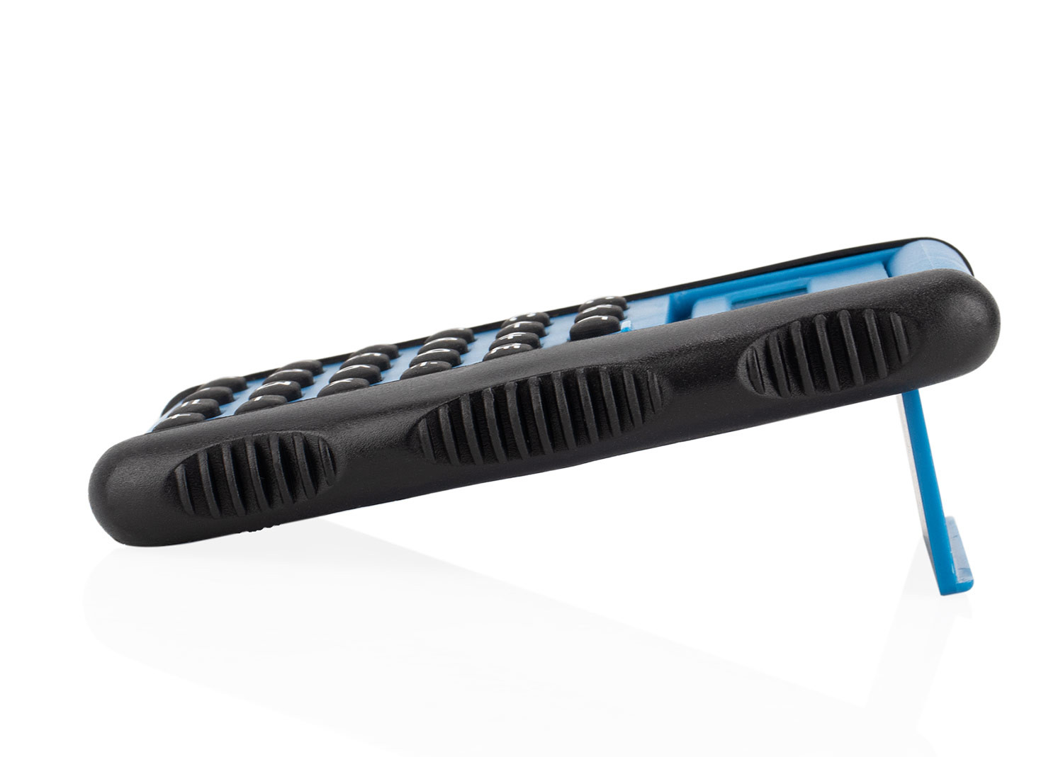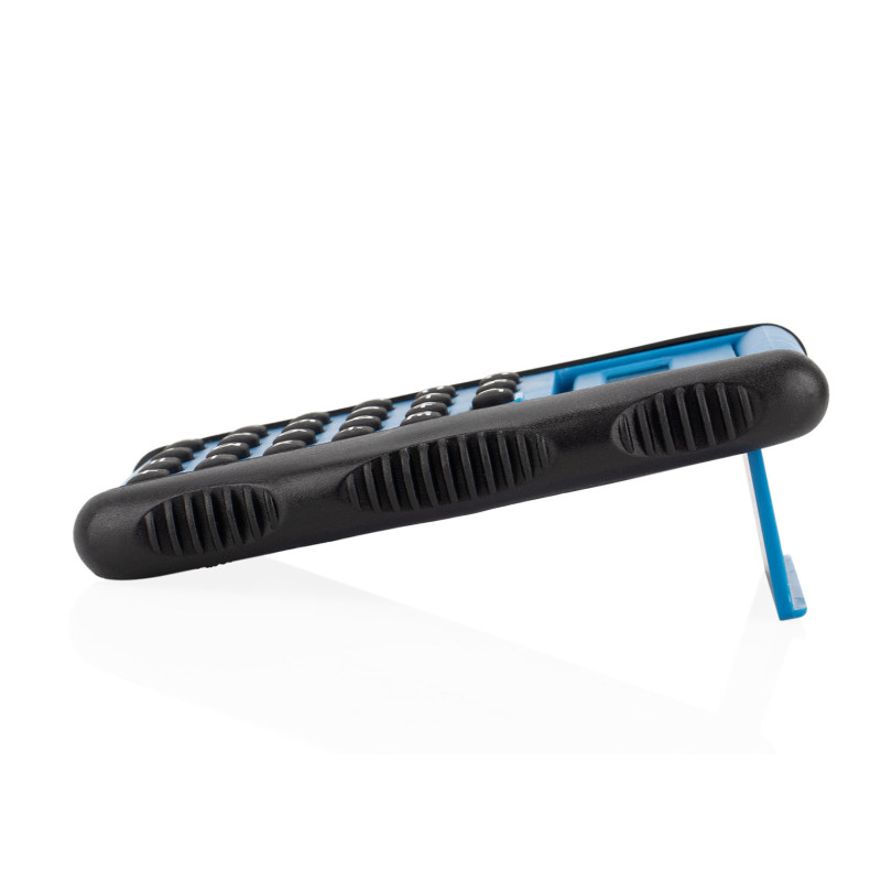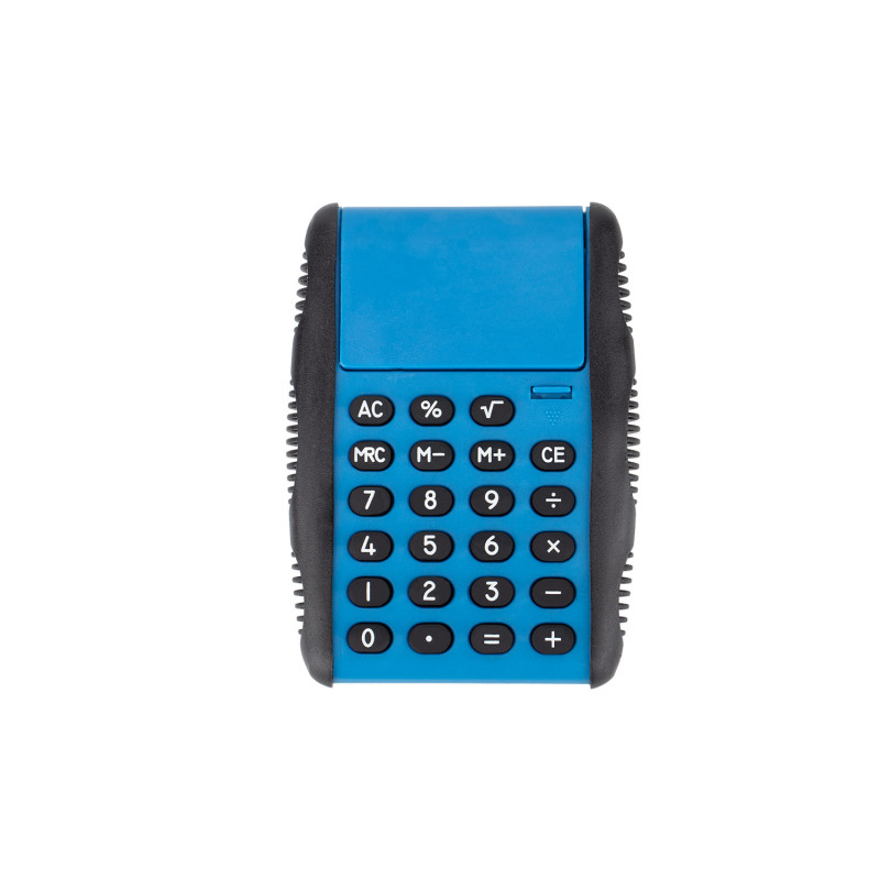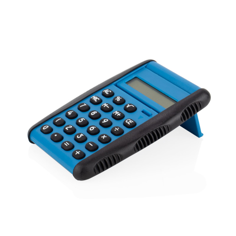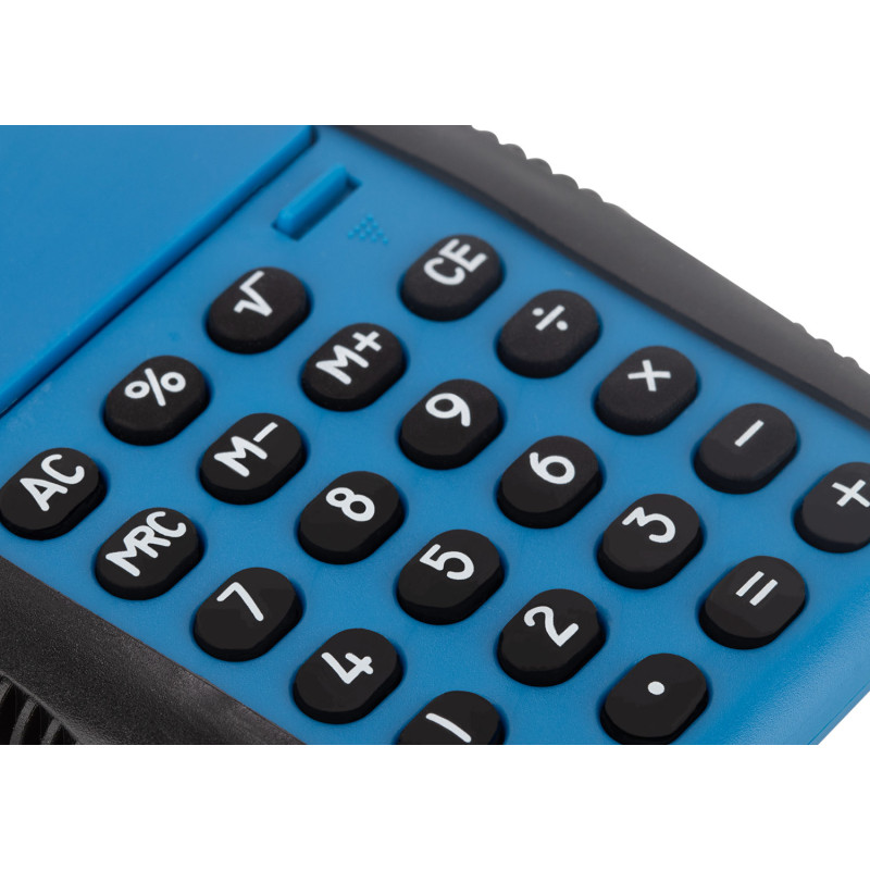 Calculadora de escritorio con diseño funcional. Cuenta con una palanca que, al bajarla, destapa el visor y convierte la tapa en una base de apoyo. Incluye funciones estándar como operaciones básicas, porcentaje, raíz cuadrada, memoria y corrección. Su estructura con agarres laterales texturizados facilita su manipulación.