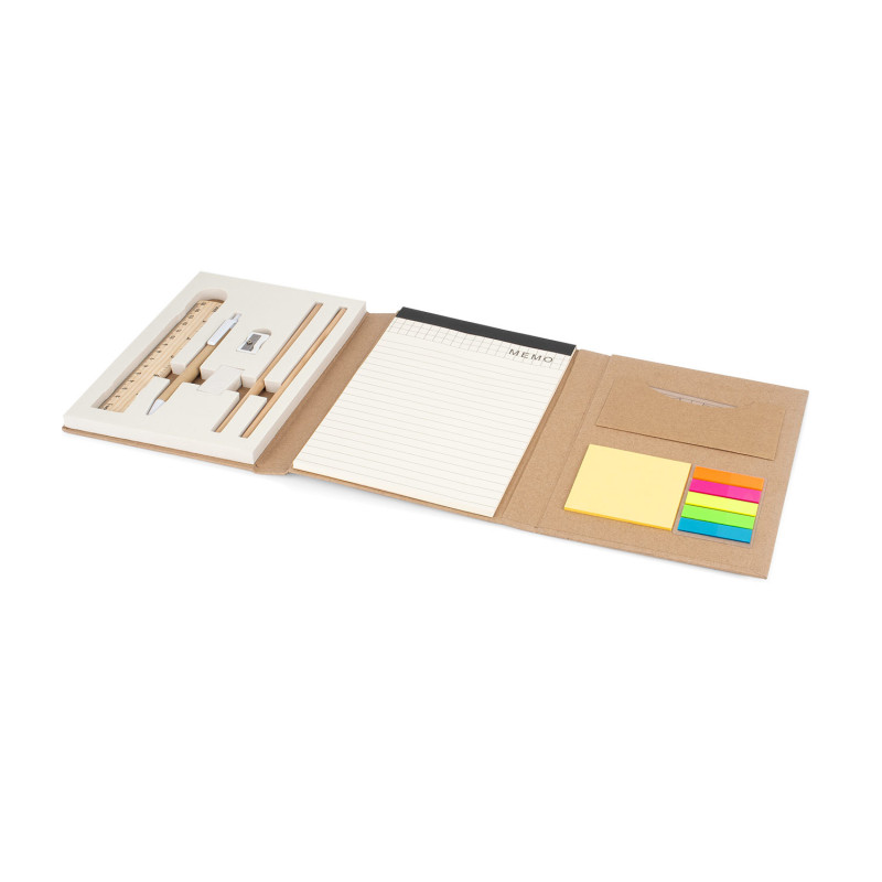 Set de bloc de notas, tapa de cartón, tamaño A5, 80 hojas con pegatinas de colores, regla, bolígrafo, sacapuntas, borrador y lápices.