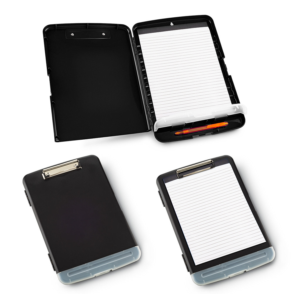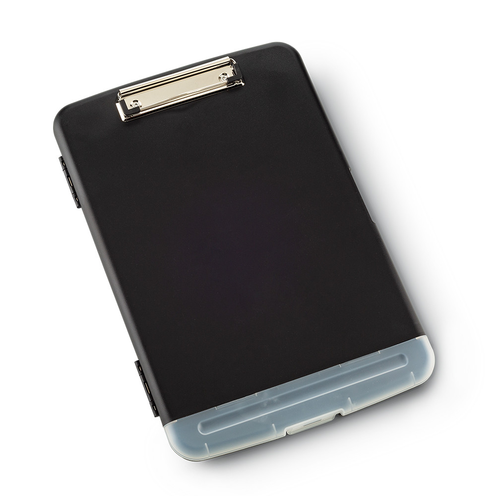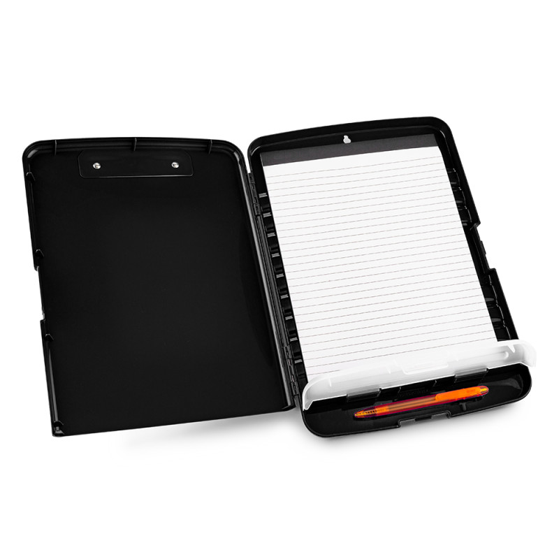 Tabla plástica para anotar. Con compartimiento para hojas y otro para bolígrafos. Con clip metálico.