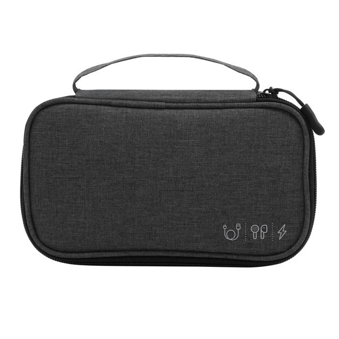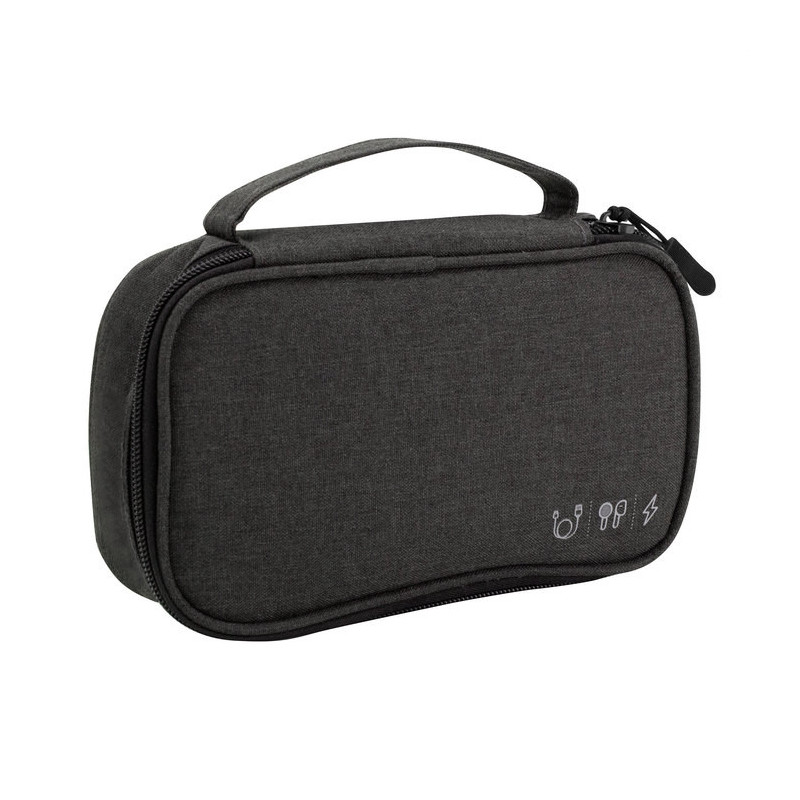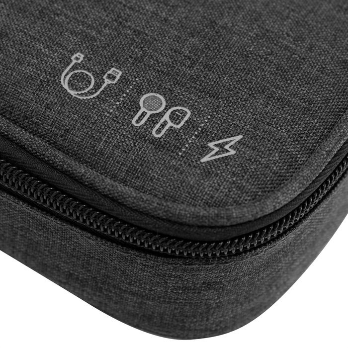 ORGANIZADOR DE CABLES "DENVER" Organizador de cables. Estructura acolchada. Asa para transportar. Compartimento principal con cierre con tirador engomado. Interior forrado. En uno de sus lados cuenta con un bolsillo principal y dos pequeños de red, y en el lado contrario tiene un elástico con velcro multipropósito.
