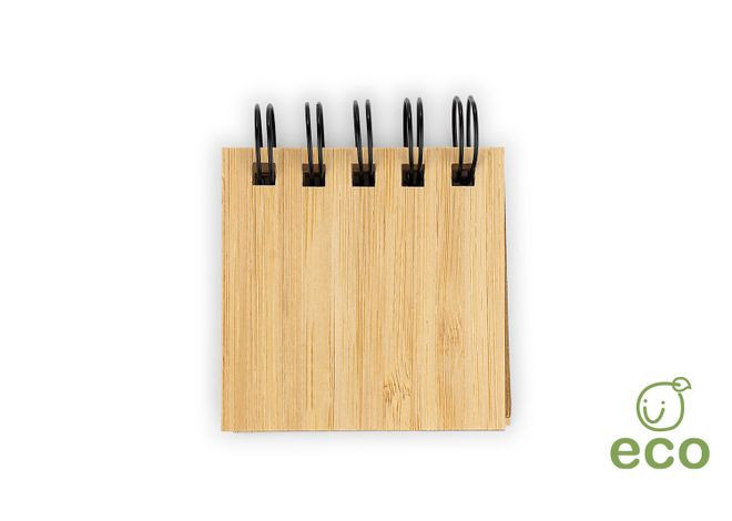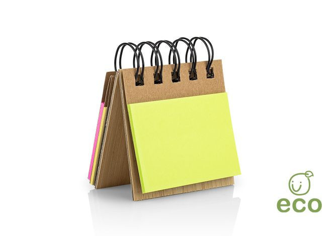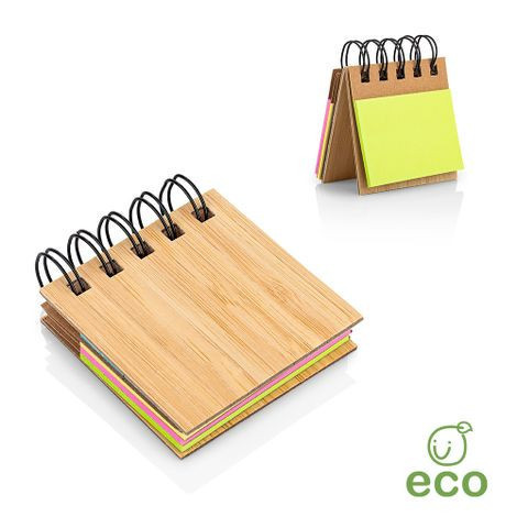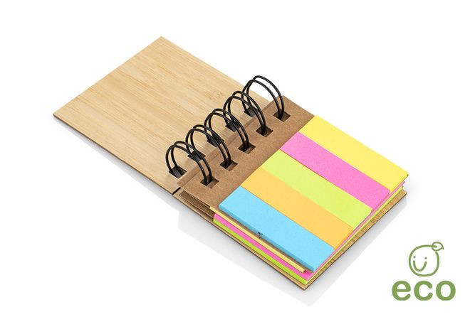 Set de memos Bamboo, Set de memos con argollado doble O y cubierta en Bambú. 3 set de memos adhesivos por 40 hojas y 5 colores de banderas en papel x 25 unidades cada color.