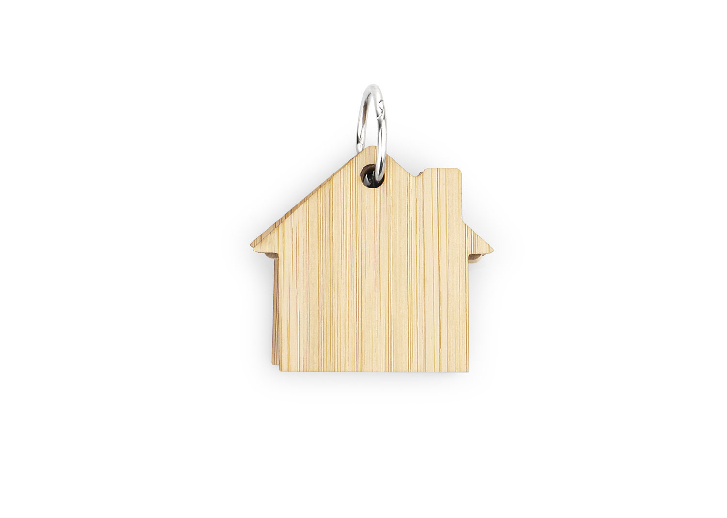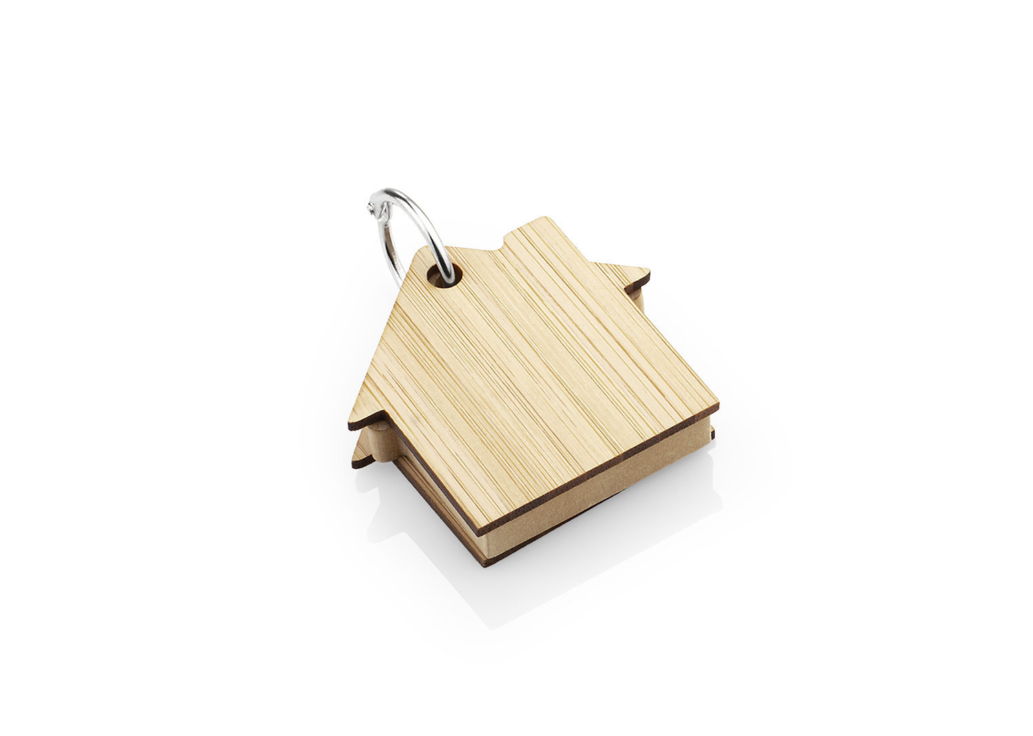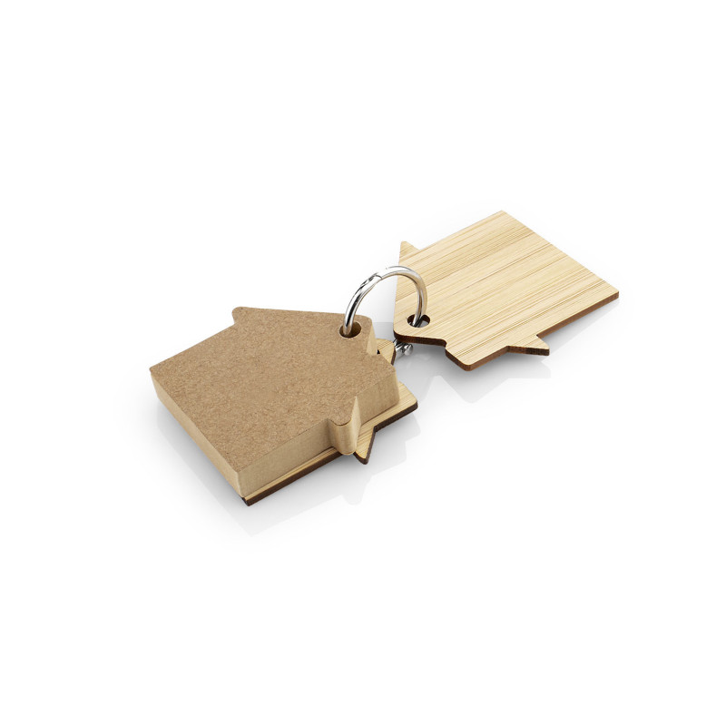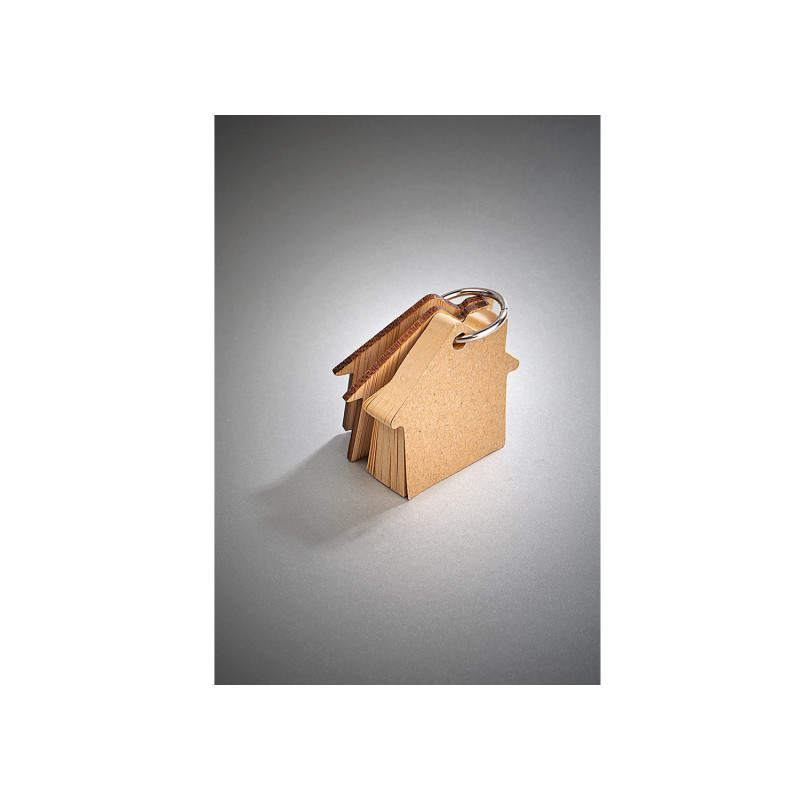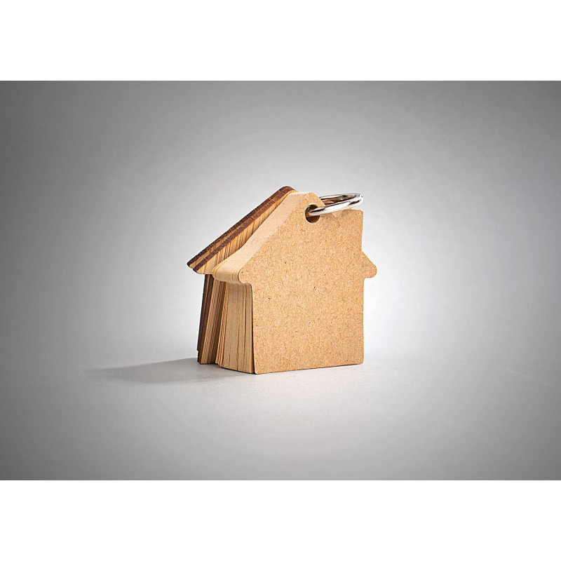 Llavero de bambú con 80 hojas de memos adhesivos en papel reciclado color natural en forma de casa.