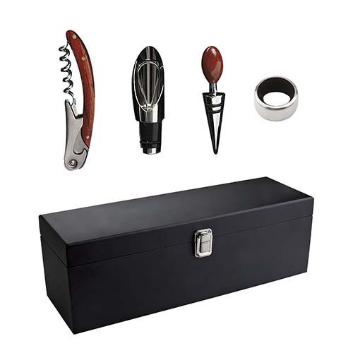 Incluye sacacorchos con navaja, stopper, boquilla y arillo.