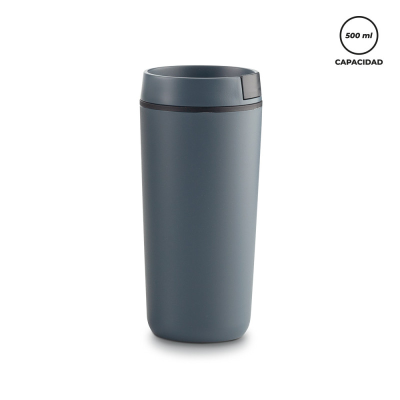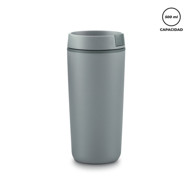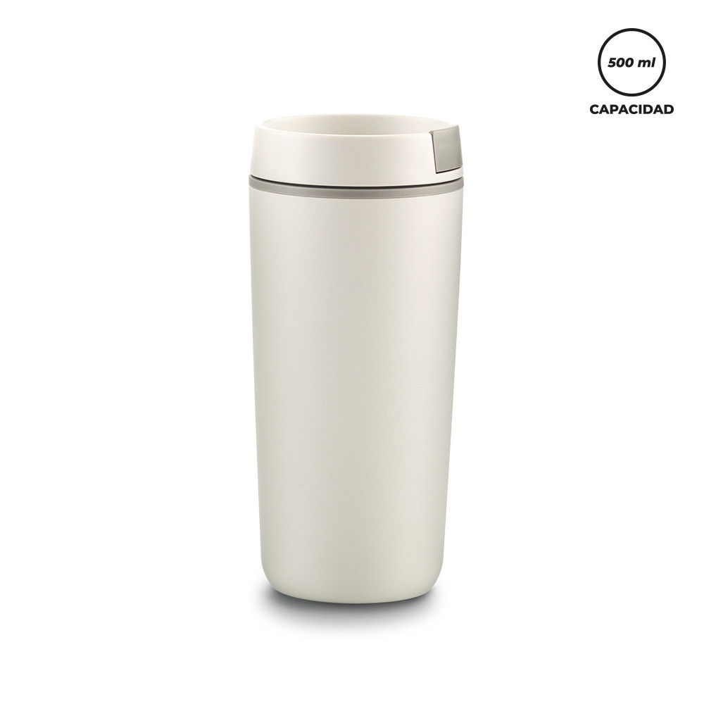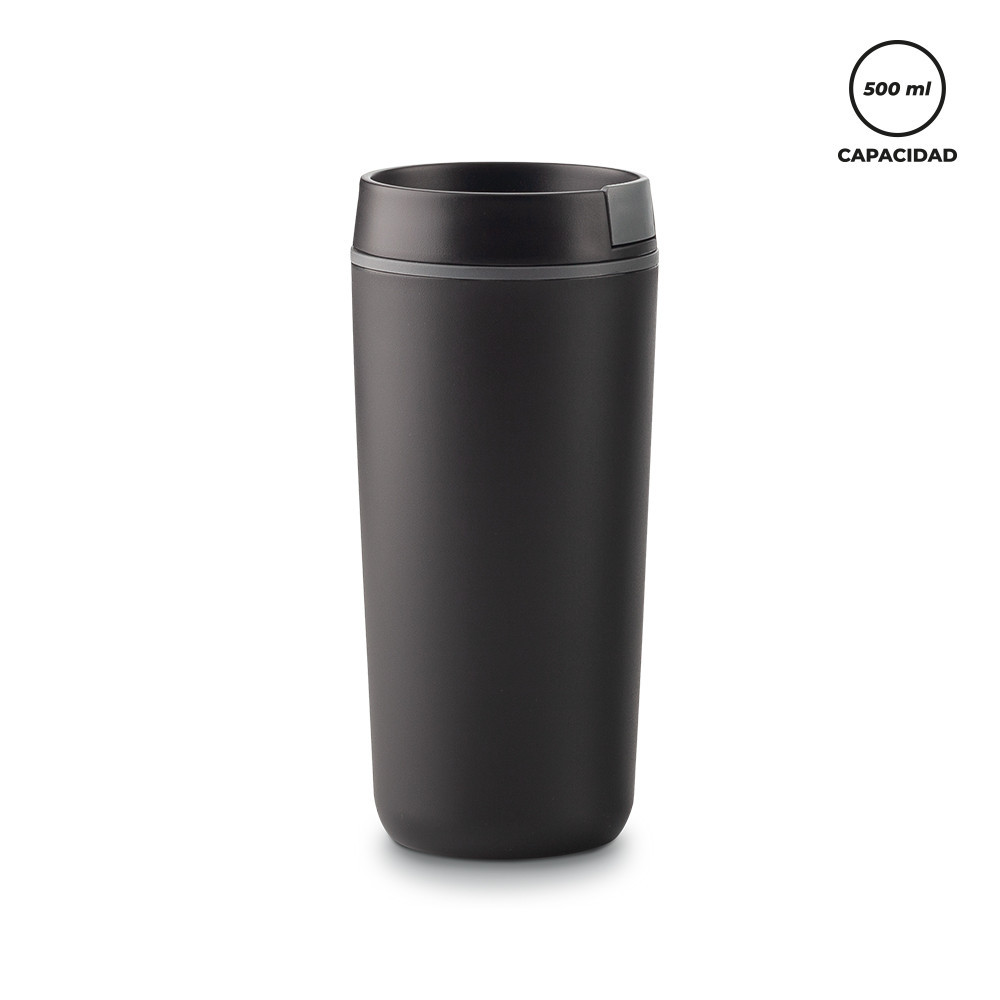 Mug plástico doble pared. Tapa plástica protectora de cierre rosca. Empaque caja individual.