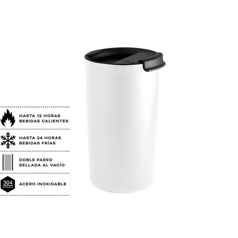 MUG TÉRMICO "GARAMOND" Mug con aislamiento térmico vacuum. Interior en acero 304 y exterior en acero 201 con acabado mate. Tapa PP y anillo de silicona antivuelco. Base antideslizante con almohadilla de EVA color negro. Mantiene por más de 12 hs la temperatura de las bebidas calientes y 24 hs de las bebidas frías. Presentación en caja de regalo kraft.