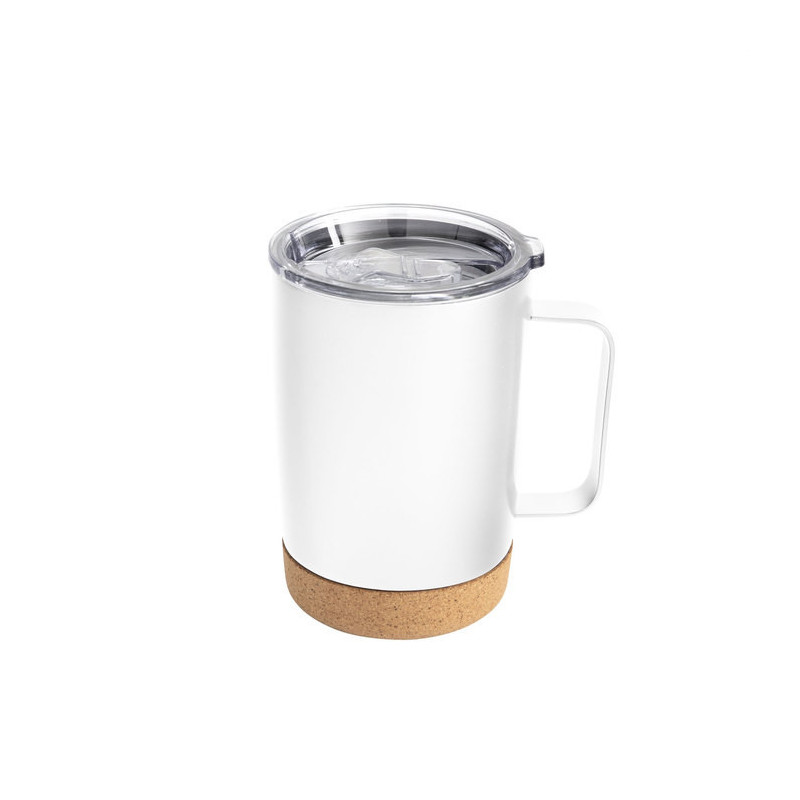 Diseño elegante con base de corcho. Mug doble pared con asa, sellado al vacío. Mug con aislamiento térmico. Tecnología vacuum. Interior en acero 304 y exterior en acero 201. Tapa de poliestireno con anillo de silicona. Asa metálica. Base de corcho. Pintura acabado semi mate. Mantiene hasta 12 hs la temperatura de las bebidas calientes y 24 hs de las bebidas frías.