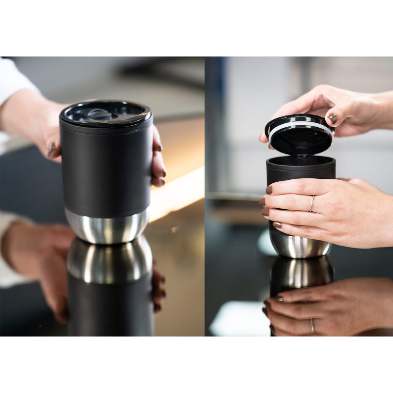 Vaso plástico para café. Resistente, con recubrimiento inferior de metal. Tapa con boquilla para deslizar con caucho en la rosca para evitar derrames. Capacidad 300ml/10 Oz