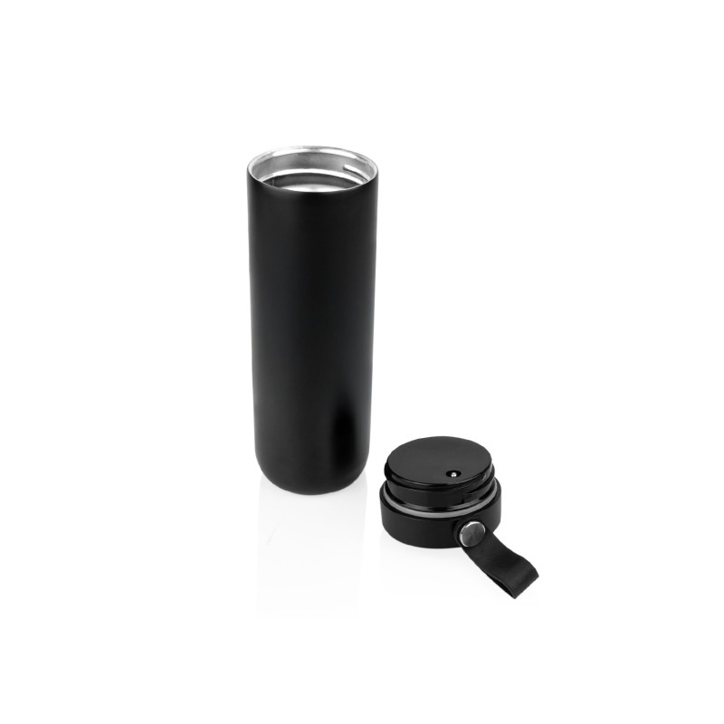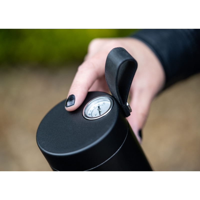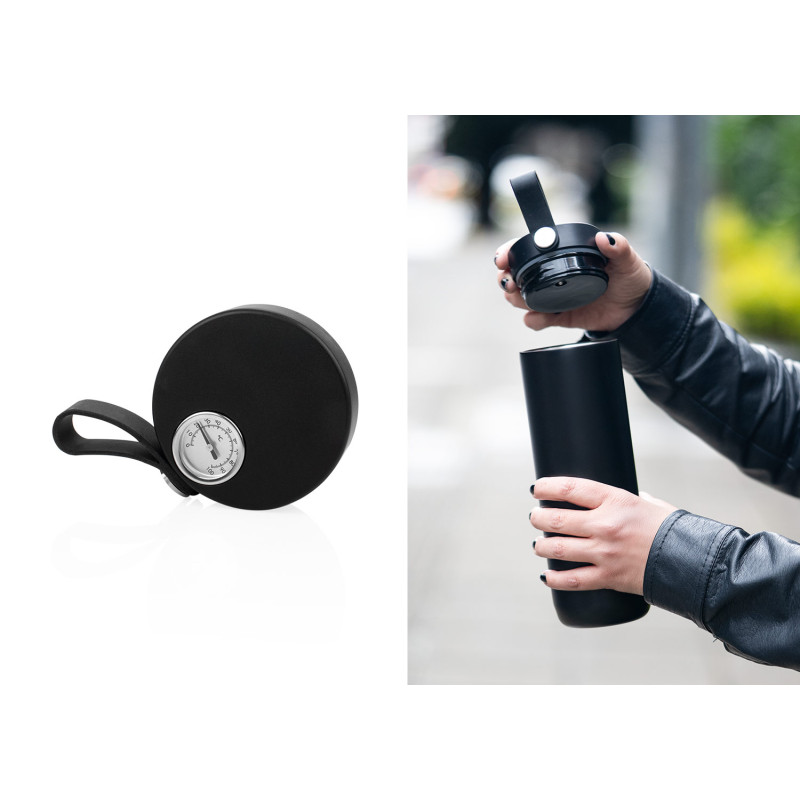 Botella Vacuum de acero inoxidable al vacío de doble pared, color mate lacado. Tapa de plástico con indicador mecánico de temperatura y asa de silicona. Capacidad: 500 ml / 17 Oz.
