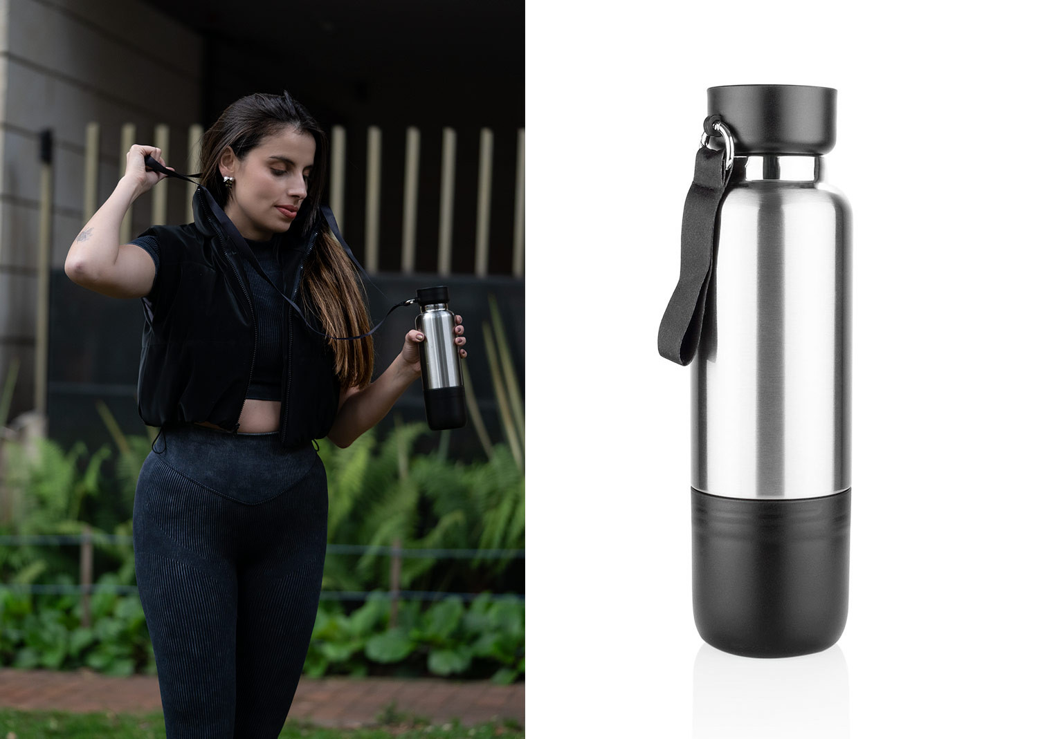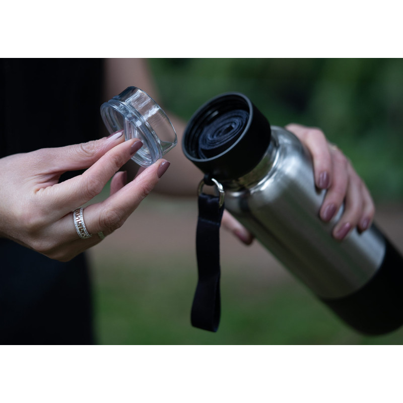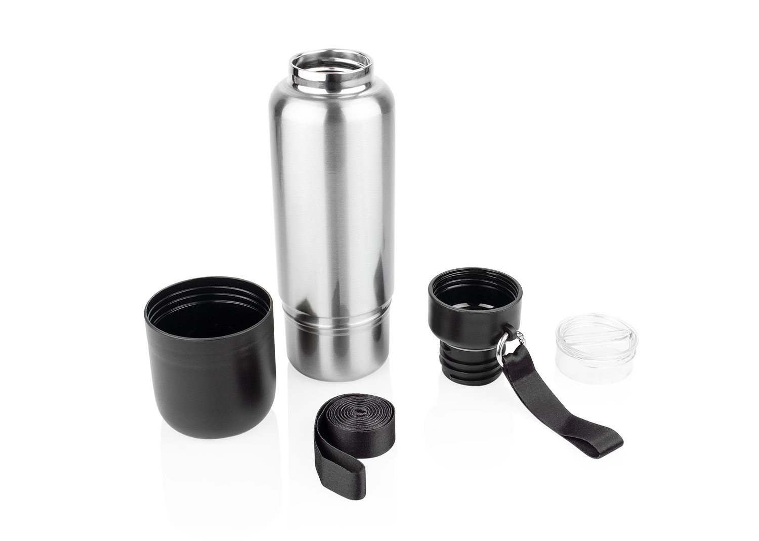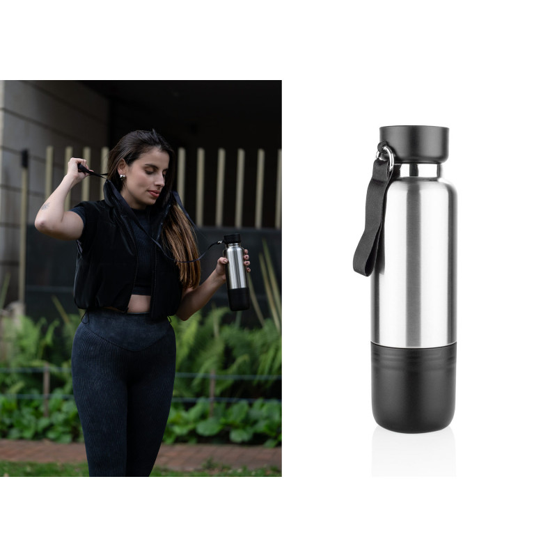 Botella Vacuum. Cuerpo de acero inoxidable de doble pared al vacío. Tapa de plástico con función de almacenamiento y cordón de 2 tamaños. Base de plástico extraíble con función de taza. Capacidad: 500 ml / 17 Oz.