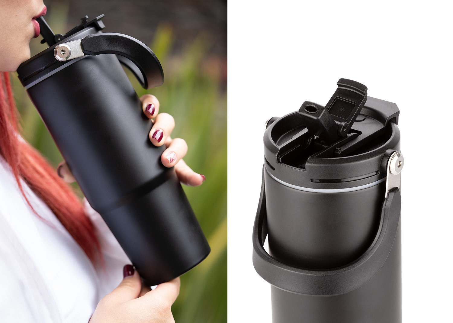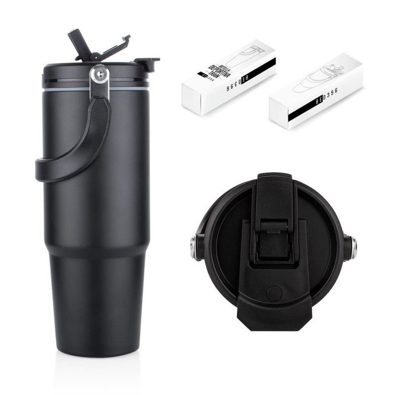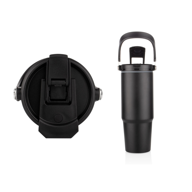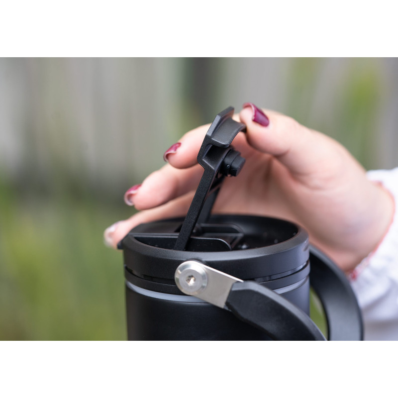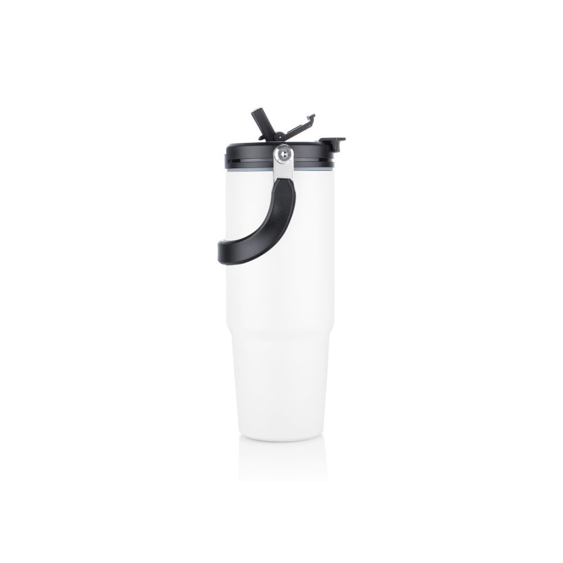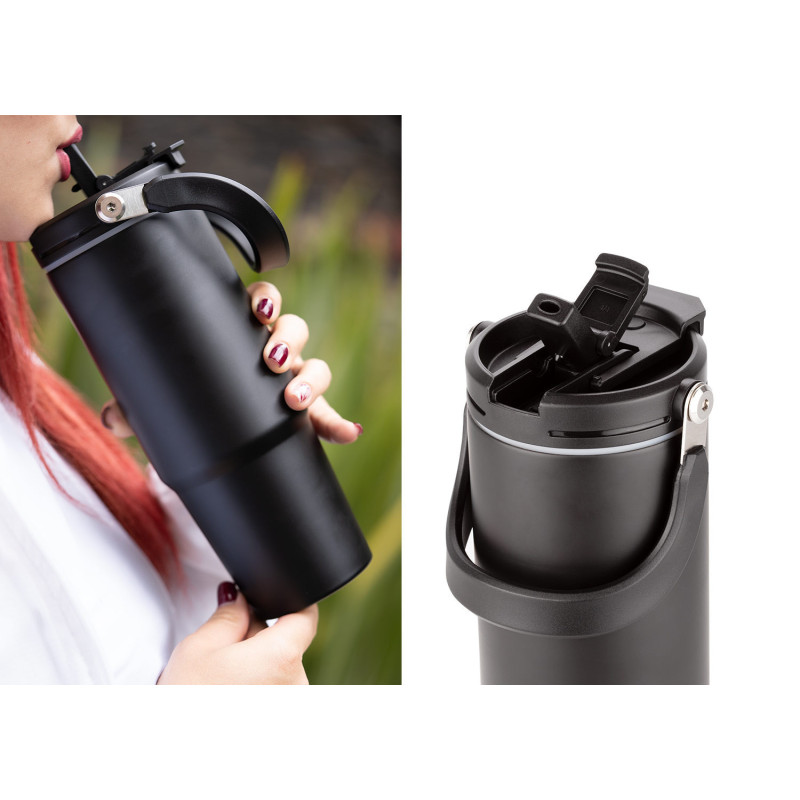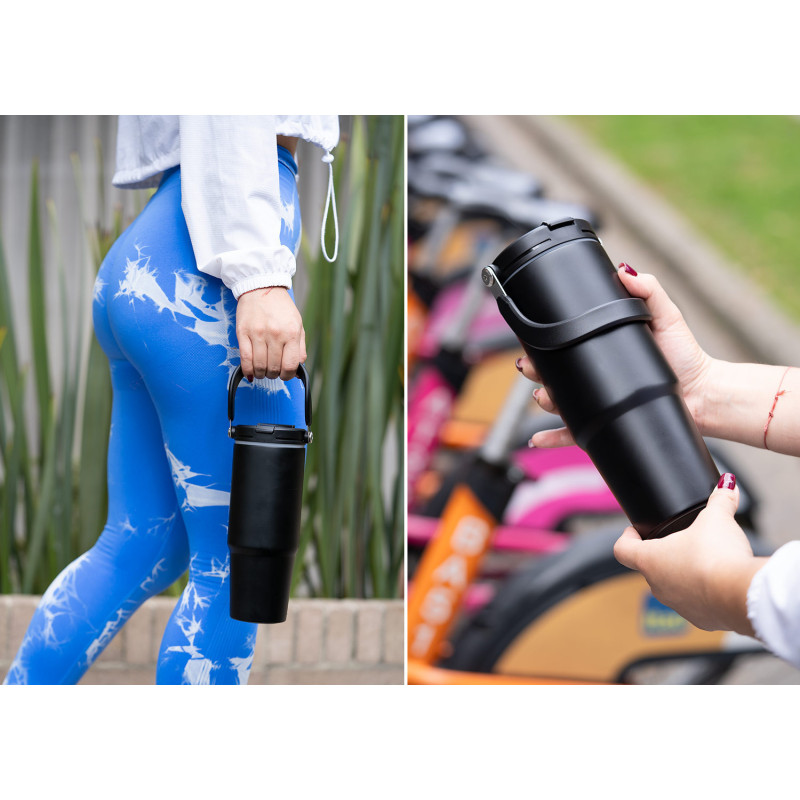 Esta botella metálica es ideal para todo tipo de bebidas. Cuenta con una manija resistente, integrada en la tapa mediante una sólida pieza de metal, que facilita su transporte y almacenamiento. Dispone de dos boquillas para el consumo de líquidos: una tipo boquilla y otra tipo pitillo, ambas con tapas de seguridad. Además, posee un borde de caucho que previene derrames. Capacidad 900 ml/ 30 Oz