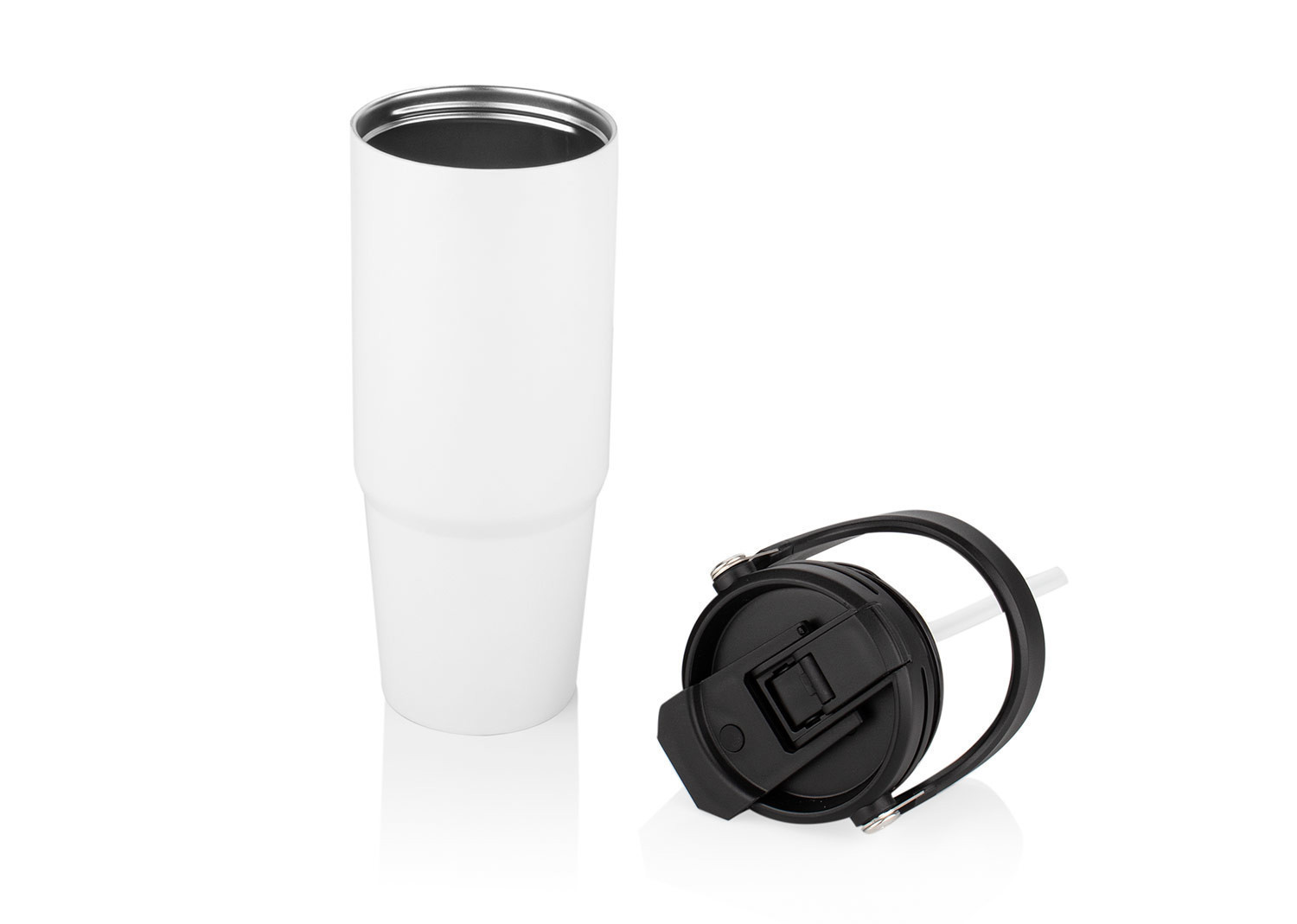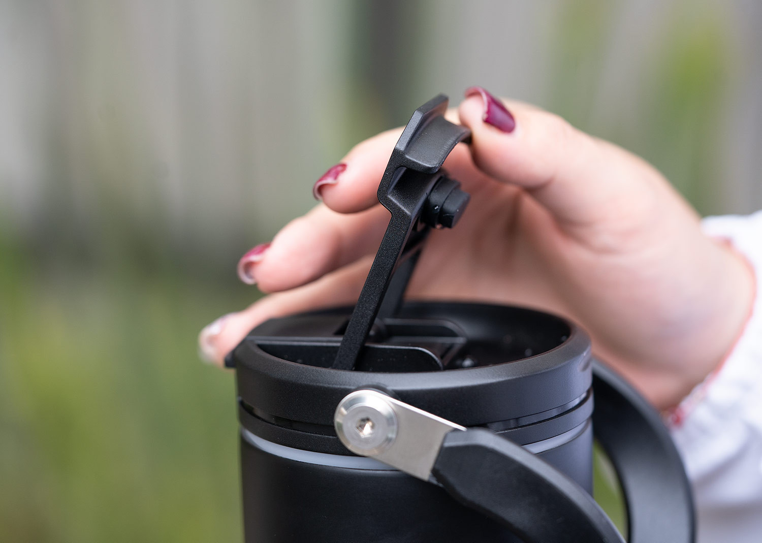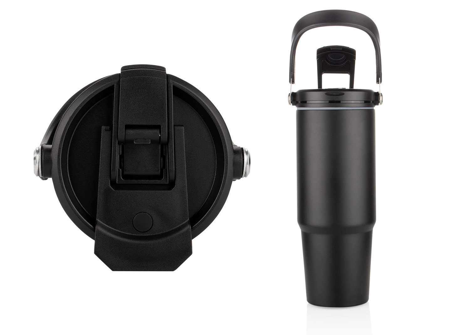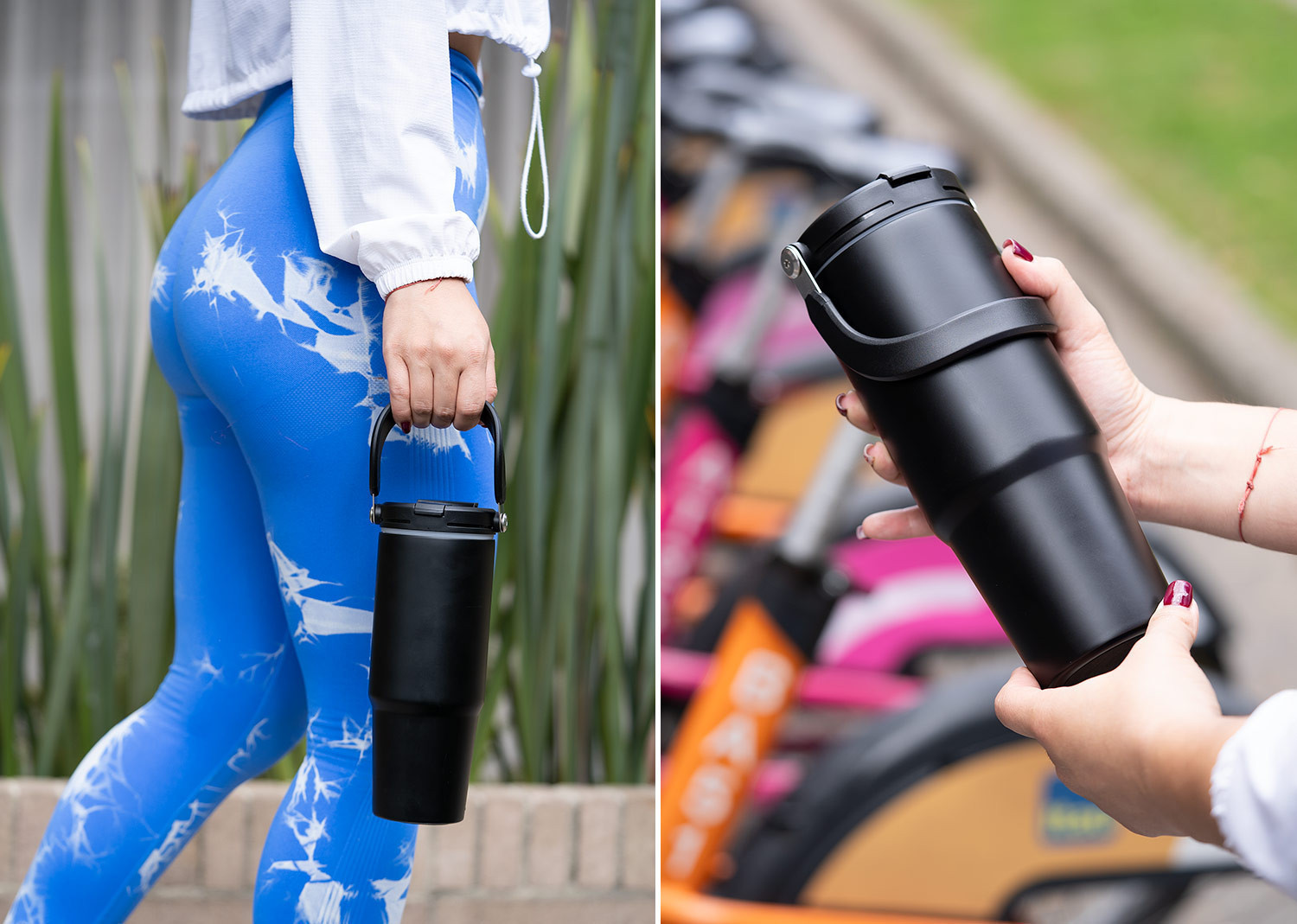 Esta botella metálica es ideal para todo tipo de bebidas. Cuenta con una manija resistente, integrada en la tapa mediante una sólida pieza de metal, que facilita su transporte y almacenamiento. Dispone de dos boquillas para el consumo de líquidos: una tipo boquilla y otra tipo pitillo, ambas con tapas de seguridad. Además, posee un borde de caucho que previene derrames. Capacidad 900 ml/ 30 Oz