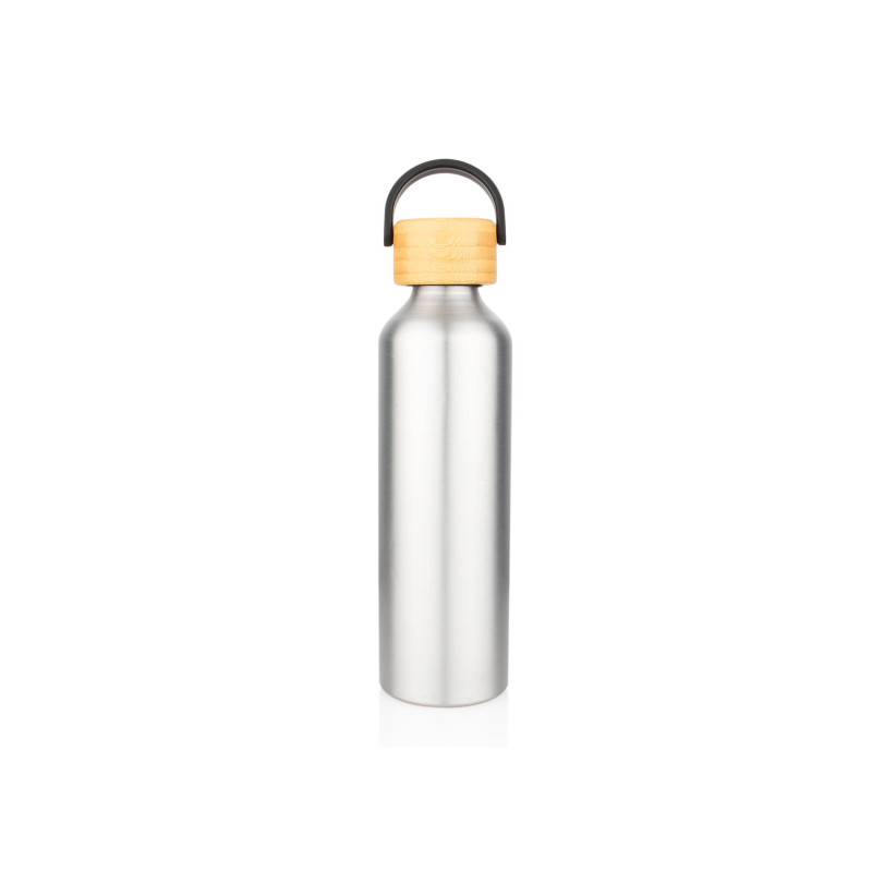 Botella de aluminio con tapa de bambú y asa, ideal para quienes buscan estilo y funcionalidad en un solo producto. Su diseño moderno y resistente la convierte en una excelente opción para el día a día. La tapa con cierre giratorio garantiza un ajuste seguro, mientras que el asa facilita su transporte. Perfecta para mantenerte hidratado con un toque natural y elegante. Capacidad: 650 ml / 22 Oz.